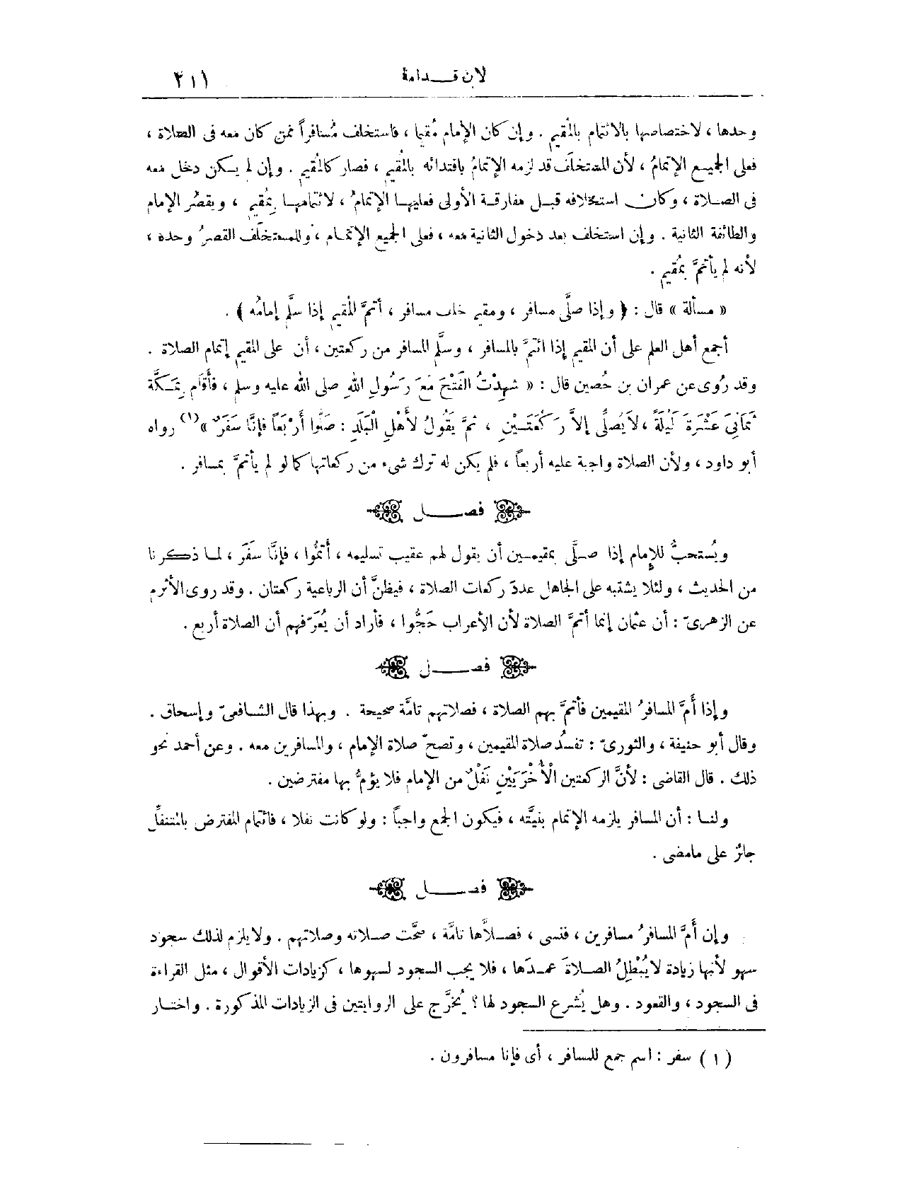 (١٢٧٧) فَصْلٌ: وَيُسْتَحَبُّ لِلْإِمَامِ إذَا صَلَّى بِمُقِيمِينَ أَنْ يَقُولَ لَهُمْ عَقِيبَ تَسْلِيمِهِ: أَتِمُّوا، فَإِنَّا سَفَرٌ. لِمَا ذَكَرْنَا مِنْ الْحَدِيثِ، وَلِئَلَّا يَشْتَبِهَ عَلَى الْجَاهِلِ عَدَدُ رَكَعَاتِ الصَّلَاةِ، فَيَظُنُّ أَنَّ الرُّبَاعِيَّةَ رَكْعَتَانِ. وَقَدْ رَوَى الْأَثْرَمُ، عَنْ الزُّهْرِيِّ، أَنَّ عُثْمَانَ إنَّمَا أَتَمَّ الصَّلَاةَ لِأَنَّ الْأَعْرَابَ حَجُّوا، فَأَرَادَ أَنْ يُعَرِّفَهُمْ أَنَّ الصَّلَاةَ أَرْبَعٌ.