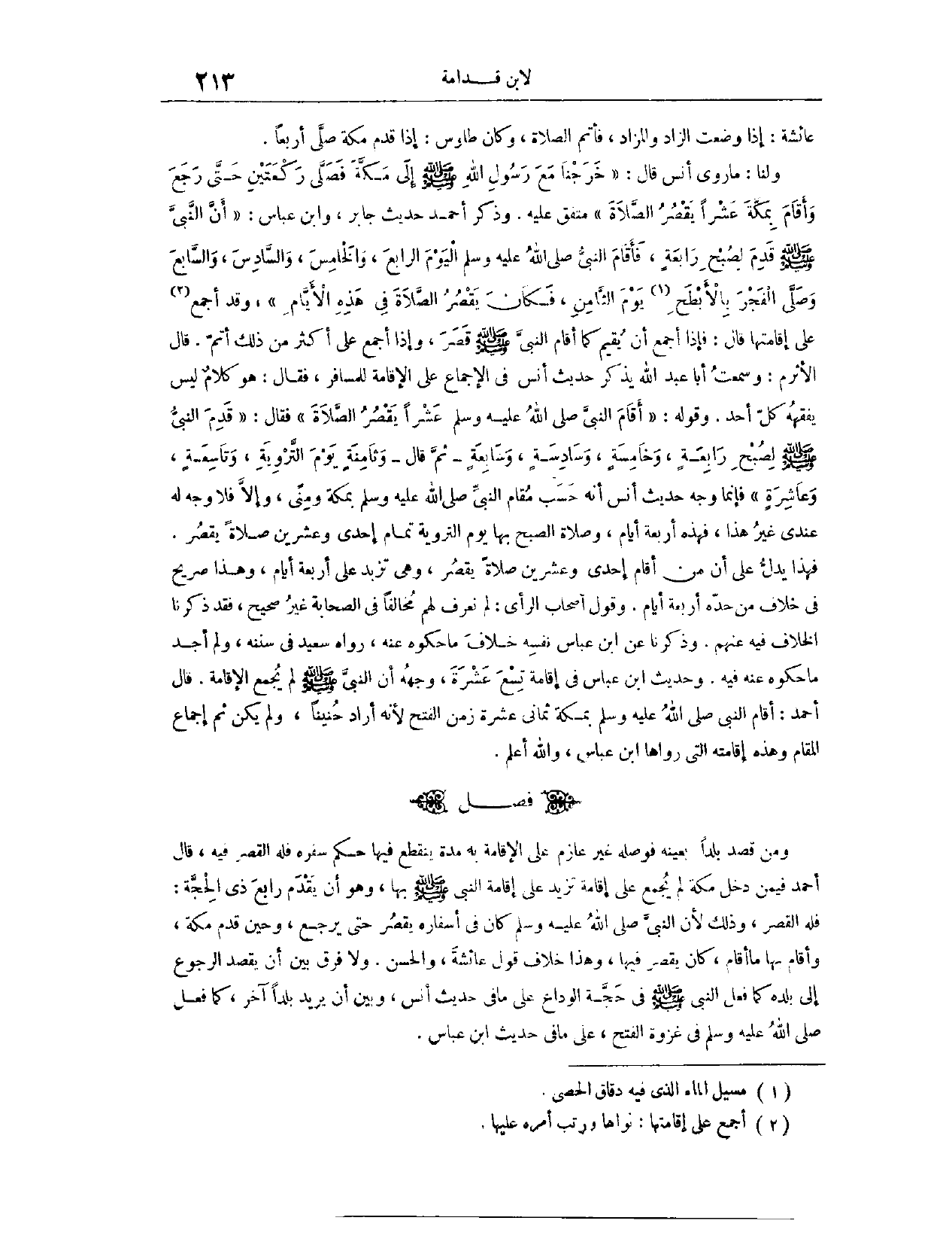 (١٢٨١) فَصْلٌ: وَمَنْ قَصَدَ بَلَدًا بِعَيْنِهِ، فَوَصَلَهُ غَيْرَ عَازِمٍ عَلَى الْإِقَامَةِ بِهِ مُدَّةً يَنْقَطِعُ فِيهَا حُكْمُ سَفَرِهِ، فَلَهُ الْقَصْرُ فِيهِ. قَالَ أَحْمَدُ، فِي مَنْ دَخَلَ مَكَّةَ لَمْ يُجْمِعْ عَلَى إقَامَةٍ تَزِيدُ عَلَى إقَامَةِ النَّبِيِّ - صَلَّى اللَّهُ عَلَيْهِ وَسَلَّمَ - بِهَا، وَهُوَ أَنْ يَقْدَمَ رَابِعَ ذِي الْحِجَّةِ: فَلَهُ الْقَصْرُ؛ وَذَلِكَ لِأَنَّ النَّبِيَّ - صَلَّى اللَّهُ عَلَيْهِ وَسَلَّمَ - كَانَ فِي أَسْفَارِهِ يَقْصُرُ حَتَّى يَرْجِعَ، وَحِينَ قَدِمَ مَكَّةَ وَأَقَامَ بِهَا مَا أَقَامَ كَانَ يَقْصُرُ فِيهَا، وَهَذَا خِلَافُ قَوْلِ عَائِشَةَ وَالْحَسَنِ.