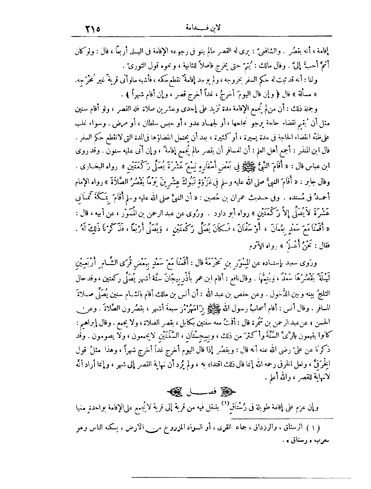 وَرَوَى سَعِيدٌ، بِإِسْنَادِهِ عَنْ الْمِسْوَرِ بْنِ مَخْرَمَةَ، قَالَ: أَقَمْنَا مَعَ سَعْدٍ بِبَعْضِ قُرَى الشَّامِ أَرْبَعِينَ لَيْلَةً يَقْصُرُهَا سَعْدٌ، وَنُتِمُّهَا. وَقَالَ نَافِعٌ: أَقَامَ ابْنُ عُمَرَ بِأَذْرَبِيجَانَ سِتَّةَ أَشْهُرٍ يُصَلِّي رَكْعَتَيْنِ، وَقَدْ حَالَ الثَّلْجُ بَيْنَهُ وَبَيْنَ الدُّخُولِ. وَعَنْ حَفْصِ بْنِ عَبْدِ اللَّهِ: أَنَّ أَنَسَ بْنَ مَالِكٍ أَقَامَ بِالشَّامِ سَنَتَيْنِ يُصَلِّي صَلَاةَ الْمُسَافِرِ. وَقَالَ أَنَسٌ: أَقَامَ أَصْحَابُ رَسُولِ اللَّهِ - صَلَّى اللَّهُ عَلَيْهِ وَسَلَّمَ - بِرَامَهُرْمُزَ سَبْعَةَ أَشْهُرٍ يَقْصُرُونَ الصَّلَاةَ.