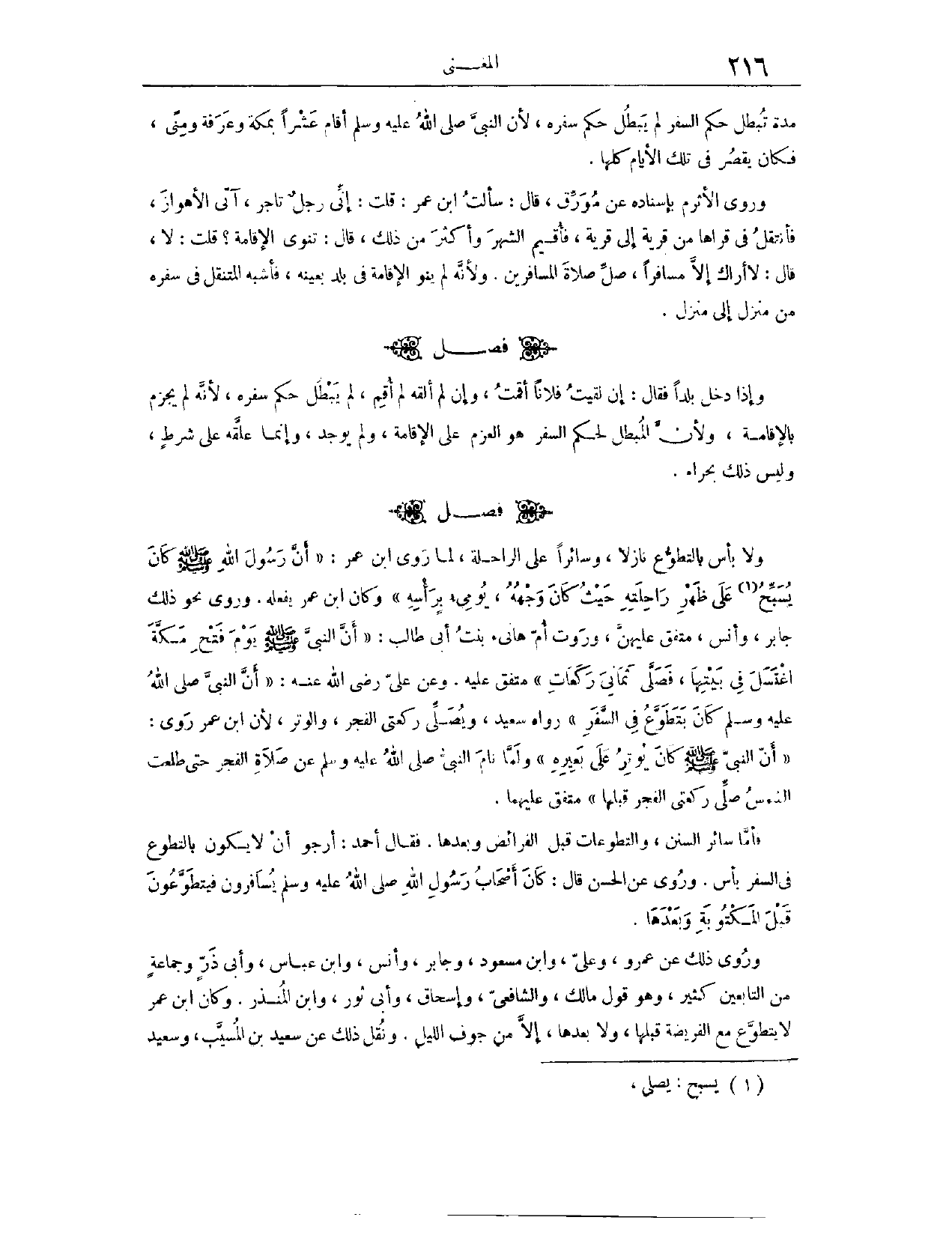 (١٢٨٨) فَصْلٌ: وَلَا بَأْسَ بِالتَّطَوُّعِ نَازِلًا وَسَائِرًا عَلَى الرَّاحِلَةِ؛ لِمَا رَوَى ابْنُ عُمَرَ، «أَنَّ رَسُولَ اللَّهِ - صَلَّى اللَّهُ عَلَيْهِ وَسَلَّمَ - كَانَ يُسَبِّحُ عَلَى ظَهْرِ رَاحِلَتِهِ حَيْثُ كَانَ وَجْهُهُ يُومِئُ بِرَأْسِهِ.» وَكَانَ ابْنُ عُمَرَ يَفْعَلُهُ. وَرُوِيَ نَحْوُ ذَلِكَ عَنْ جَابِرٍ، وَأَنَسٍ. مُتَّفَقٌ عَلَيْهِنَّ. وَرَوَتْ أُمُّ هَانِئٍ بِنْتُ أَبِي طَالِبٍ، «أَنَّ النَّبِيَّ - صَلَّى اللَّهُ عَلَيْهِ وَسَلَّمَ - يَوْمَ فَتْحِ مَكَّةَ اغْتَسَلَ فِي بَيْتِهَا، فَصَلَّى ثَمَانِيَ رَكَعَاتٍ» . مُتَّفَقٌ عَلَيْهِ. وَعَنْ عَلِيٍّ - رَضِيَ اللَّهُ عَنْهُ - «أَنَّ النَّبِيَّ - صَلَّى اللَّهُ عَلَيْهِ وَسَلَّمَ - كَانَ يَتَطَوَّعُ فِي السَّفَرِ.» رَوَاهُ سَعِيدٌ. وَيُصَلِّي رَكْعَتَيْ الْفَجْرِ وَالْوَتْرَ؛ لِأَنَّ ابْنَ عُمَرَ رَوَى أَنَّ النَّبِيَّ - صَلَّى اللَّهُ عَلَيْهِ وَسَلَّمَ - كَانَ يُوتِرُ عَلَى بَعِيرِهِ وَلَمَّا نَامَ النَّبِيُّ - صَلَّى اللَّهُ عَلَيْهِ وَسَلَّمَ - عَنْ صَلَاةِ الْفَجْرِ حَتَّى طَلَعَتْ الشَّمْسُ، صَلَّى رَكْعَتَيْ الْفَجْرِ قَبْلَهَا. مُتَّفَقٌ عَلَيْهِمَا.