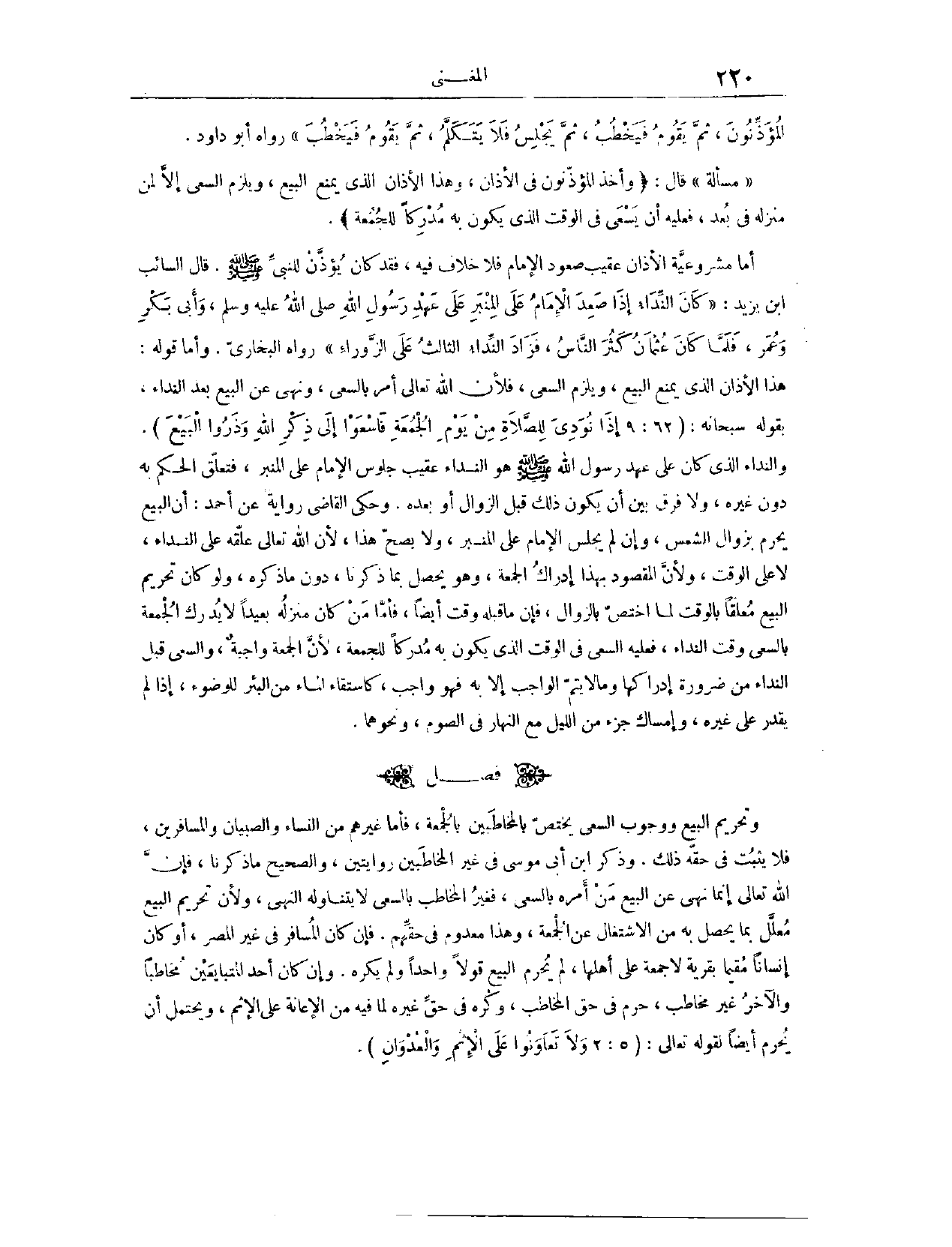 (١٢٩٣) فَصْلٌ: وَتَحْرِيمُ الْبَيْعِ، وَوُجُوبُ السَّعْيِ، يَخْتَصُّ بِالْمُخَاطَبِينَ بِالْجُمُعَةِ، فَأَمَّا غَيْرُهُمْ مِنْ النِّسَاءِ وَالصِّبْيَانِ وَالْمُسَافِرِينَ، فَلَا يَثْبُتُ فِي حَقِّهِ ذَلِكَ. وَذَكَرَ ابْنُ أَبِي مُوسَى فِي غَيْرِ الْمُخَاطَبِينَ رِوَايَتَيْنِ. وَالصَّحِيحُ مَا ذَكَرْنَا؛ فَإِنَّ اللَّهَ تَعَالَى إنَّمَا نَهَى عَنْ الْبَيْعِ مَنْ أَمَرَهُ بِالسَّعْيِ، فَغَيْرُ الْمُخَاطَبِ بِالسَّعْيِ لَا يَتَنَاوَلُهُ النَّهْيُ، وَلِأَنَّ تَحْرِيمَ الْبَيْعِ مُعَلَّلٌ بِمَا يَحْصُلُ بِهِ مِنْ الِاشْتِغَالِ عَنْ الْجُمُعَةِ، وَهَذَا مَعْدُومٌ فِي حَقِّهِمْ.