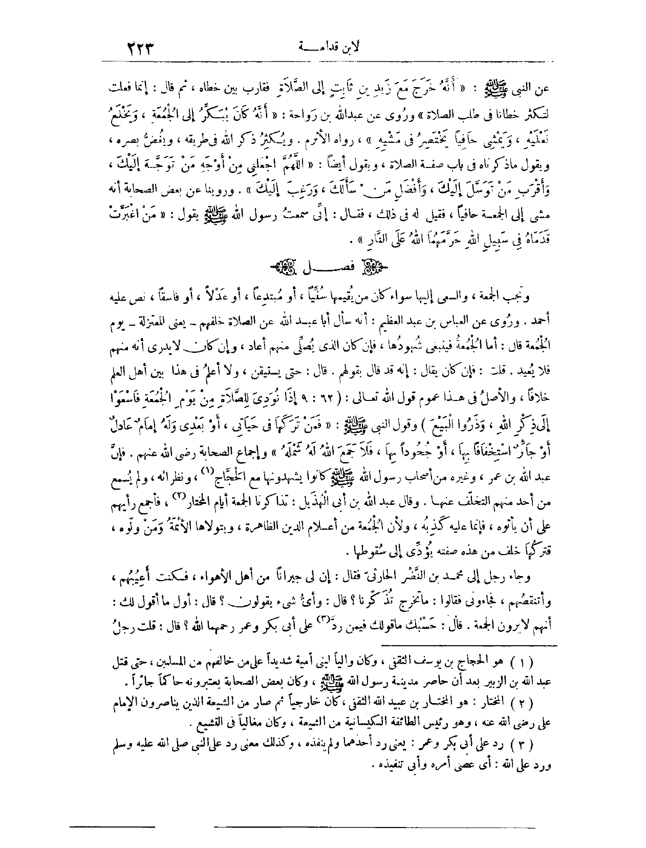 قُلْتُ: فَإِنْ كَانَ يُقَالُ: إنَّهُ قَدْ قَالَ بِقَوْلِهِمْ قَالَ: حَتَّى يَسْتَيْقِنَ. وَلَا أَعْلَمُ فِي هَذَا بَيْنَ أَهْلِ الْعِلْمِ خِلَافًا، وَالْأَصْلُ فِي هَذَا عُمُومُ قَوْلِ اللَّهِ تَعَالَى: {إِذَا نُودِيَ لِلصَّلاةِ مِنْ يَوْمِ الْجُمُعَةِ فَاسْعَوْا إِلَى ذِكْرِ اللَّهِ وَذَرُوا الْبَيْعَ} [الجمعة: ٩] وَقَوْلُ النَّبِيِّ: - صَلَّى اللَّهُ عَلَيْهِ وَسَلَّمَ - «فَمَنْ تَرَكَهَا فِي حَيَاتِي أَوْ بَعْدِي وَلَهُ إمَامٌ عَادِلٌ أَوْ جَائِرٌ، اسْتِخْفَافًا بِهَا، أَوْ جُحُودًا بِهَا، فَلَا جَمَعَ اللَّهُ لَهُ شَمْلَهُ» . وَإِجْمَاعُ الصَّحَابَةِ، - رَضِيَ اللَّهُ عَنْهُمْ -، فَإِنَّ عَبْدَ اللَّهِ بْنَ عُمَرَ وَغَيْرَهُ مِنْ أَصْحَابِ رَسُولِ اللَّهِ - صَلَّى اللَّهُ عَلَيْهِ وَسَلَّمَ - كَانُوا يَشْهَدُونَهَا مَعَ الْحَجَّاجِ وَنُظَرَائِهِ، وَلَمْ يُسْمَعْ مِنْ أَحَدٍ مِنْهُمْ التَّخَلُّفُ عَنْهَا.