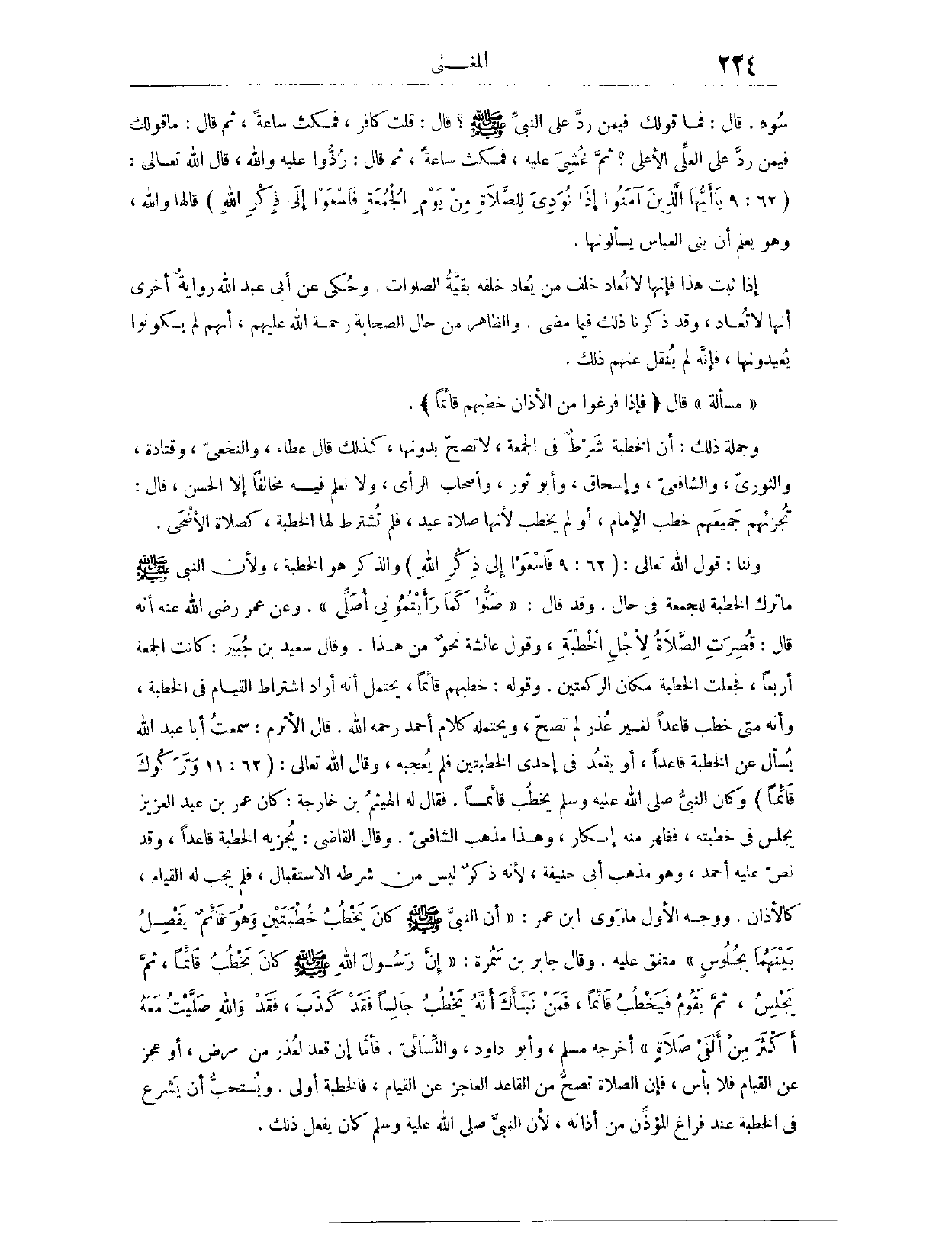 وَقَوْلُهُ: " خَطَبَهُمْ قَائِمًا ". يَحْتَمِلُ أَنَّهُ أَرَادَ اشْتِرَاطَ الْقِيَامِ فِي الْخُطْبَةِ، وَأَنَّهُ مَتَى خَطَبَ قَاعِدًا لِغَيْرِ عُذْرٍ، لَمْ تَصِحَّ. وَيَحْتَمِلُهُ كَلَامُ أَحْمَدَ، - رَحِمَهُ اللَّهُ -.