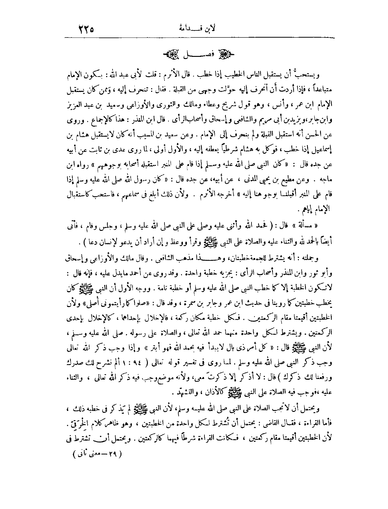 (١٢٩٩) فَصْلٌ: وَيُسْتَحَبُّ أَنْ يَسْتَقْبِلَ النَّاسُ الْخَطِيبَ إذَا خَطَبَ. قَالَ الْأَثْرَمُ: قُلْتُ لِأَبِي عَبْدِ اللَّهِ: يَكُونُ الْإِمَامُ عَنْ يَمِينِي مُتَبَاعِدًا، فَإِذَا أَرَدْتُ أَنْ أَنْحَرِفَ إلَيْهِ حَوَّلْتُ وَجْهِي عَنْ الْقِبْلَةِ، فَقَالَ: نَعَمْ، تَنْحَرِفُ إلَيْهِ وَمِمَّنْ كَانَ يَسْتَقْبِلُ الْإِمَامَ ابْنُ عُمَرَ، وَأَنَسٌ. وَهُوَ قَوْلُ شُرَيْحٍ، وَعَطَاءٍ، وَمَالِكٍ، وَالثَّوْرِيِّ، وَالْأَوْزَاعِيِّ، وَسَعِيدِ بْنِ عَبْدِ الْعَزِيزِ، وَابْنِ جَابِرٍ، وَيَزِيدَ بْنِ أَبِي مَرْيَمَ، وَالشَّافِعِيِّ، وَإِسْحَاقَ، وَأَصْحَابِ الرَّأْيِ.