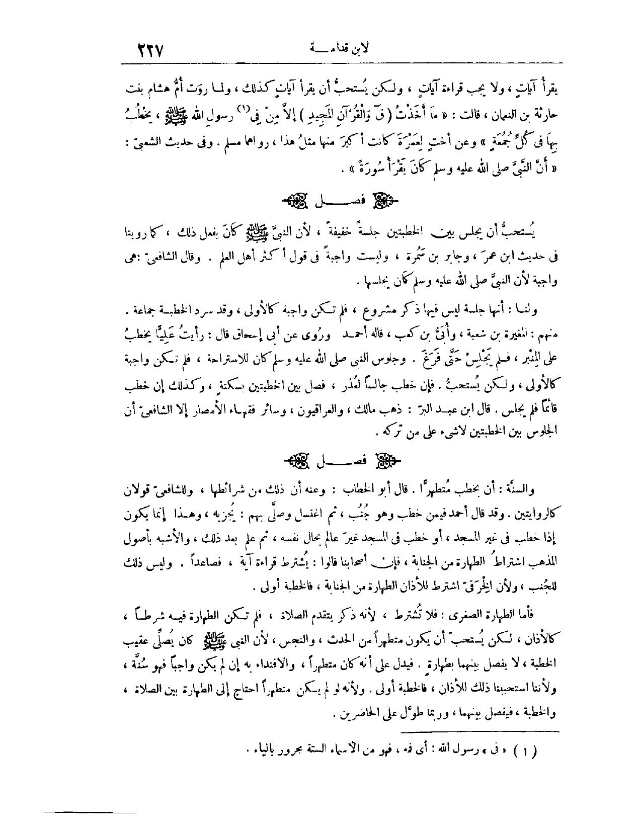 (١٣٠٢) فَصْلٌ: وَالسُّنَّةُ أَنْ يَخْطُبَ مُتَطَهِّرًا. قَالَ أَبُو الْخَطَّابِ: وَعَنْهُ أَنَّ ذَلِكَ مِنْ شَرَائِطِهَا، وَلِلشَّافِعِيِّ قَوْلَانِ، كَالرِّوَايَتَيْنِ. وَقَدْ قَالَ أَحْمَدُ، فِي مَنْ خَطَبَ وَهُوَ جُنُبٌ، ثُمَّ اغْتَسَلَ وَصَلَّى بِهِمْ: يُجْزِئُهُ. وَهَذَا إنَّمَا يَكُونُ إذَا خَطَبَ فِي غَيْرِ الْمَسْجِدِ، أَوْ خَطَبَ فِي الْمَسْجِدِ غَيْرَ عَالِمٍ بِحَالِ نَفْسِهِ، ثُمَّ عَلِمَ بَعْدَ ذَلِكَ، وَالْأَشْبَهُ بِأُصُولِ الْمَذْهَبِ اشْتِرَاطُ الطَّهَارَةِ مِنْ الْجَنَابَةِ؛ فَإِنَّ أَصْحَابَنَا قَالُوا: يُشْتَرَطُ قِرَاءَةُ آيَةٍ فَصَاعِدًا. وَلَيْسَ ذَلِكَ لِلْجُنُبِ، وَلِأَنَّ الْخِرَقِيِّ اشْتَرَطَ لِلْأَذَانِ الطَّهَارَةَ مِنْ الْجَنَابَةِ، فَالْخُطْبَةُ أَوْلَى.