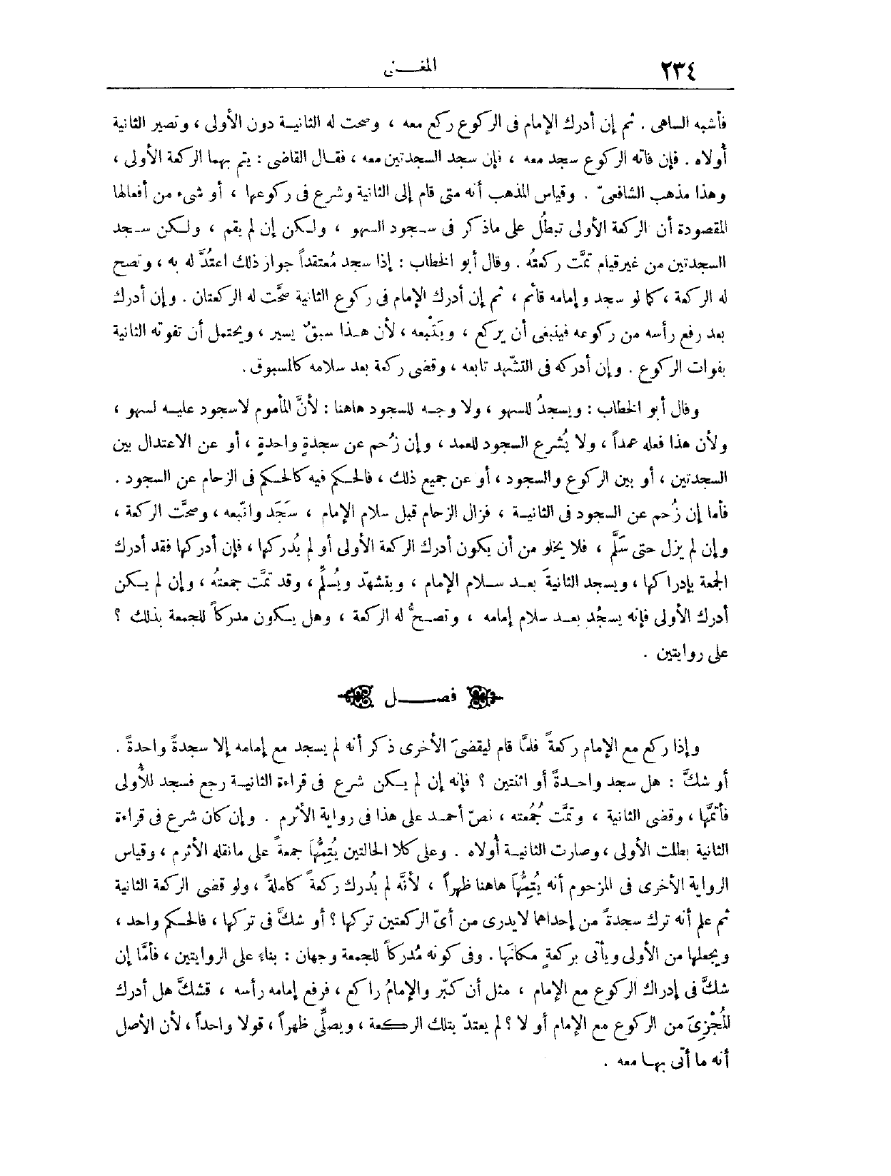وَقِيَاسُ الْمَذْهَبِ أَنَّهُ مَتَى قَامَ إلَى الثَّانِيَةِ، وَشَرَعَ فِي رُكُوعِهَا، أَوْ شَيْءٍ مِنْ أَفْعَالِهَا الْمَقْصُودَةِ، أَنَّ الرَّكْعَةَ الْأُولَى تَبْطُلُ، عَلَى مَا ذُكِرَ فِي سُجُودِ السَّهْوِ، وَلَكِنْ إنْ لَمْ يَقُمْ، وَلَكِنْ سَجَدَ السَّجْدَتَيْنِ مِنْ غَيْرِ قِيَامٍ، تَمَّتْ رَكْعَتُهُ. وَقَالَ أَبُو الْخَطَّابِ: إذَا سَجَدَ مُعْتَقِدًا جَوَازَ ذَلِكَ، اُعْتُدَّ لَهُ بِهِ، وَتَصِحُّ لَهُ الرَّكْعَةُ، كَمَا لَوْ سَجَدَ وَإِمَامُهُ قَائِمٌ، ثُمَّ إنْ أَدْرَكَ الْإِمَامَ فِي رُكُوعِ الثَّانِيَةِ، صَحَّتْ لَهُ الرَّكْعَتَانِ، وَإِنْ أَدْرَكَ بَعْدَ رَفْعِ رَأْسِهِ مِنْ رُكُوعِهِ، فَيَنْبَغِي أَنْ يَرْكَعَ وَيَتْبَعَهُ، لِأَنَّ هَذَا سَبْقٌ يَسِيرٌ. وَيَحْتَمِلُ أَنْ تَفُوتَهُ الثَّانِيَةُ بِفَوَاتِ الرُّكُوعِ.