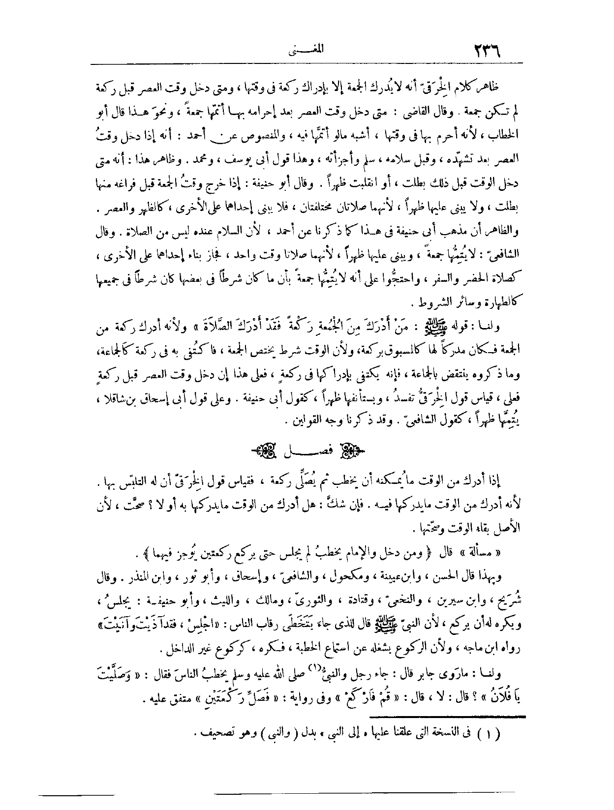 وَقَالَ الْقَاضِي: مَتَى دَخَلَ وَقْتُ الْعَصْرِ بَعْدَ إحْرَامِهِ بِهَا أَتَمَّهَا جُمُعَةً. وَنَحْوَ هَذَا قَالَ أَبُو الْخَطَّابِ؛ لِأَنَّهُ أَحْرَمَ بِهَا فِي وَقْتِهَا، أَشْبَهَ مَا لَوْ أَتَمَّهَا فِيهِ. وَالْمَنْصُوصُ عَنْ أَحْمَدَ أَنَّهُ إذَا دَخَلَ وَقْتُ الْعَصْرِ بَعْدَ تَشَهُّدِهِ وَقَبْلَ سَلَامِهِ، سَلَّمَ وَأَجْزَأَتْهُ. وَهَذَا قَوْلُ أَبِي يُوسُفَ، وَمُحَمَّدٍ. وَظَاهِرُ هَذَا أَنَّهُ مَتَى دَخَلَ الْوَقْتُ قَبْلَ ذَلِكَ، بَطَلَتْ أَوْ انْقَلَبَتْ ظُهْرًا.