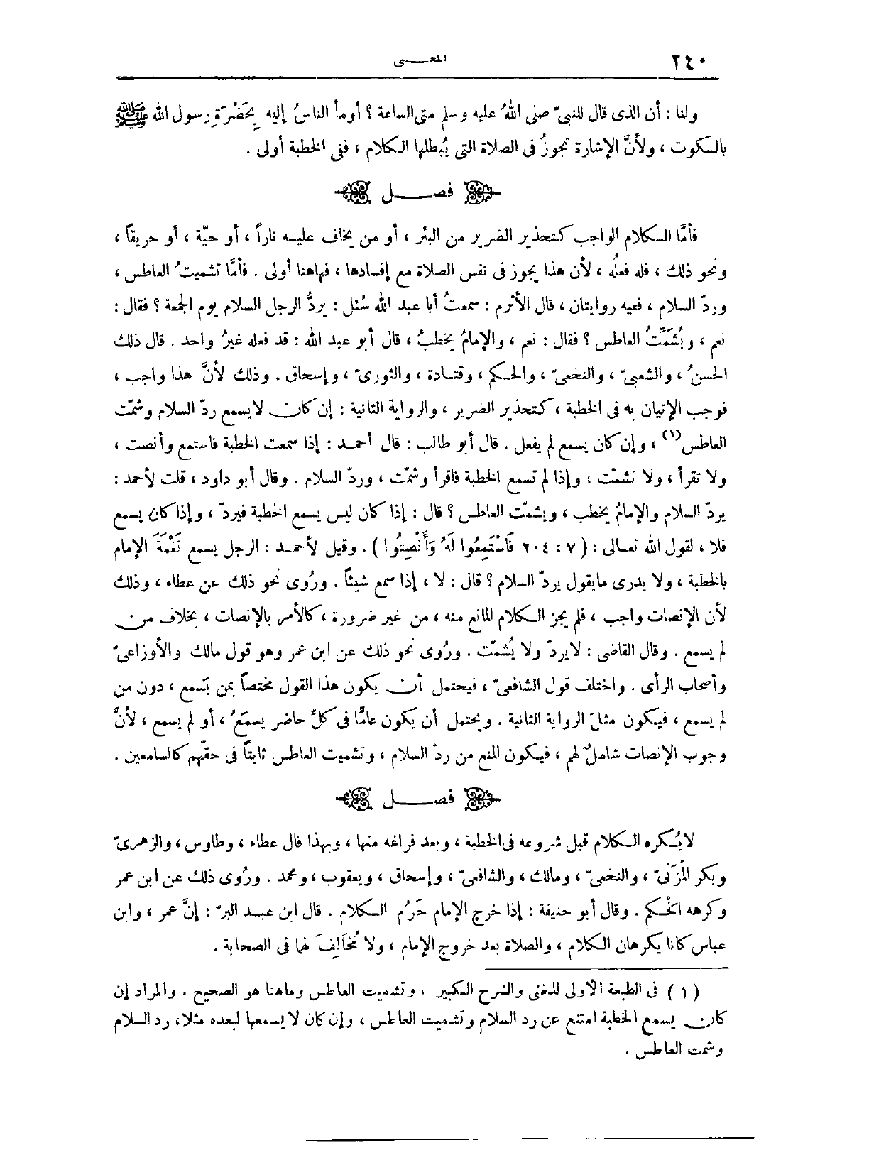(١٣٢٨) فَصْلٌ: فَأَمَّا الْكَلَامُ الْوَاجِبُ، كَتَحْذِيرِ الضَّرِيرِ مِنْ الْبِئْرِ، أَوْ مَنْ يَخَافُ عَلَيْهِ نَارًا، أَوْ حَيَّةً أَوْ حَرِيقًا، وَنَحْوَ ذَلِكَ، فَلَهُ فِعْلُهُ، لِأَنَّ هَذَا يَجُوزُ فِي نَفْسِ الصَّلَاةِ مَعَ إفْسَادِهَا، فَهَاهُنَا أَوْلَى فَأَمَّا تَشْمِيتُ الْعَاطِسِ، وَرَدُّ السَّلَامِ فَفِيهِ رِوَايَتَانِ قَالَ الْأَثْرَمُ: سَمِعْتُ أَبَا عَبْدِ اللَّهِ سُئِلَ: يَرُدُّ الرَّجُلُ السَّلَامَ يَوْمَ الْجُمُعَةِ؟ فَقَالَ: نَعَمْ. وَيُشَمِّتُ الْعَاطِسَ؟ فَقَالَ: نَعَمْ، وَالْإِمَامُ يَخْطُبُ.