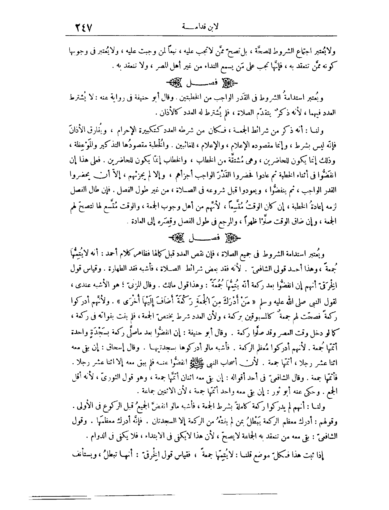 فَصْلٌ: وَيُعْتَبَرُ اسْتِدَامَةُ الشُّرُوطِ فِي الْقَدْرِ الْوَاجِبِ مِنْ الْخُطْبَتَيْنِ. وَقَالَ أَبُو حَنِيفَةَ، فِي رِوَايَةٍ عَنْهُ: لَا يُشْتَرَطُ الْعَدَدُ فِيهِمَا؛ لِأَنَّهُ ذِكْرٌ يَتَقَدَّمُ الصَّلَاةَ، فَلَمْ يُشْتَرَطْ لَهُ الْعَدَدُ، كَالْأَذَانِ. وَلَنَا، أَنَّهُ ذِكْرٌ مِنْ شَرَائِطِ الْجُمُعَةِ، فَكَانَ مِنْ شَرْطِهِ الْعَدَدُ، كَتَكْبِيرَةِ الْإِحْرَامِ، وَيُفَارِقُ الْأَذَانَ، فَإِنَّهُ لَيْسَ بِشَرْطٍ، وَإِنَّمَا مَقْصُودُهُ الْإِعْلَامُ، وَالْإِعْلَامُ لِلْغَائِبِينَ، وَالْخُطْبَةُ مَقْصُودُهَا التَّذْكِيرُ وَالْمَوْعِظَةُ، وَذَلِكَ إنَّمَا يَكُونُ لِلْحَاضِرِينَ، وَهِيَ مُشْتَقَّةٌ مِنْ الْخِطَابِ، وَالْخِطَابُ إنَّمَا يَكُونُ لِلْحَاضِرِينَ