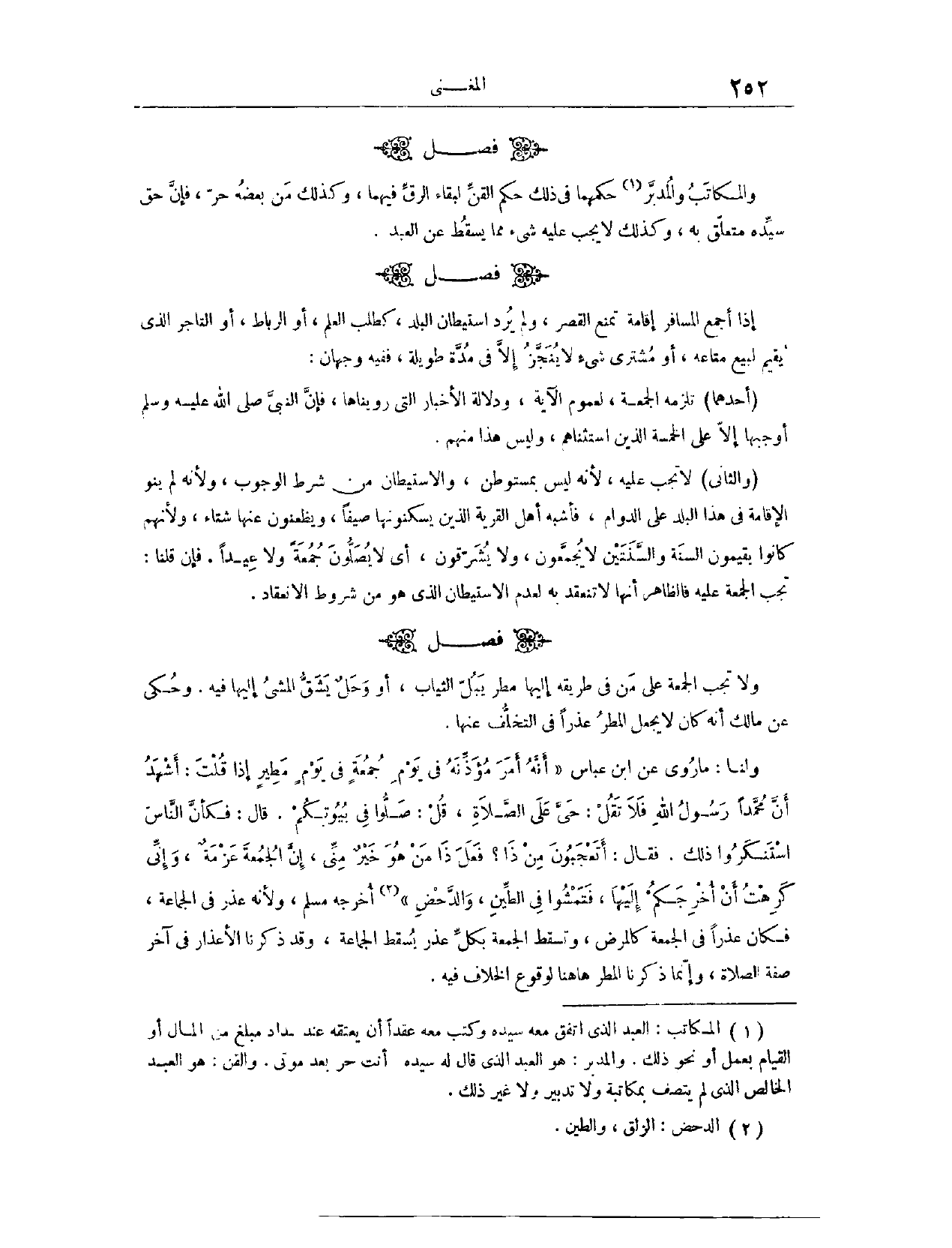 فَصْلٌ: وَالْمُكَاتَبُ وَالْمُدَبَّرُ حُكْمُهُمَا فِي ذَلِكَ حُكْمُ الْقِنِّ، لِبَقَاءِ الرِّقِّ فِيهِمَا. وَكَذَلِكَ مَنْ بَعْضُهُ حُرٌّ، فَإِنَّ حَقَّ سَيِّدِهِ مُتَعَلِّقٌ بِهِ وَكَذَلِكَ لَا يَجِبُ عَلَيْهِ شَيْءٌ مِمَّا يَسْقُطُ عَنْ الْعَبْدِ. (١٣٥٢) فَصْلٌ: إذَا أَجْمَعَ الْمُسَافِرُ إقَامَةً تَمْنَعُ الْقَصْرَ، وَلَمْ يُرِدْ اسْتِيطَانَ الْبَلَدِ كَطَلَبِ الْعِلْمِ، أَوْ الرِّبَاطِ، أَوْ التَّاجِرِ الَّذِي يُقِيمُ لِبَيْعِ مَتَاعِهِ، أَوْ مُشْتَرِي شَيْءٍ لَا يُنْجَزُ إلَّا فِي مُدَّةٍ طَوِيلَةٍ، فَفِيهِ وَجْهَانِ: أَحَدُهُمَا، تَلْزَمُهُ الْجُمُعَةُ؛ لِعُمُومِ الْآيَةِ، وَدَلَالَةِ الْأَخْبَارِ الَّتِي رَوَيْنَاهَا، فَإِنَّ النَّبِيَّ - صَلَّى اللَّهُ عَلَيْهِ وَسَلَّمَ - أَوْجَبَهَا إلَّا عَلَى الْخَمْسَةِ الَّذِينَ اسْتَثْنَاهُمْ، وَلَيْسَ هَذَا مِنْهُمْ.
