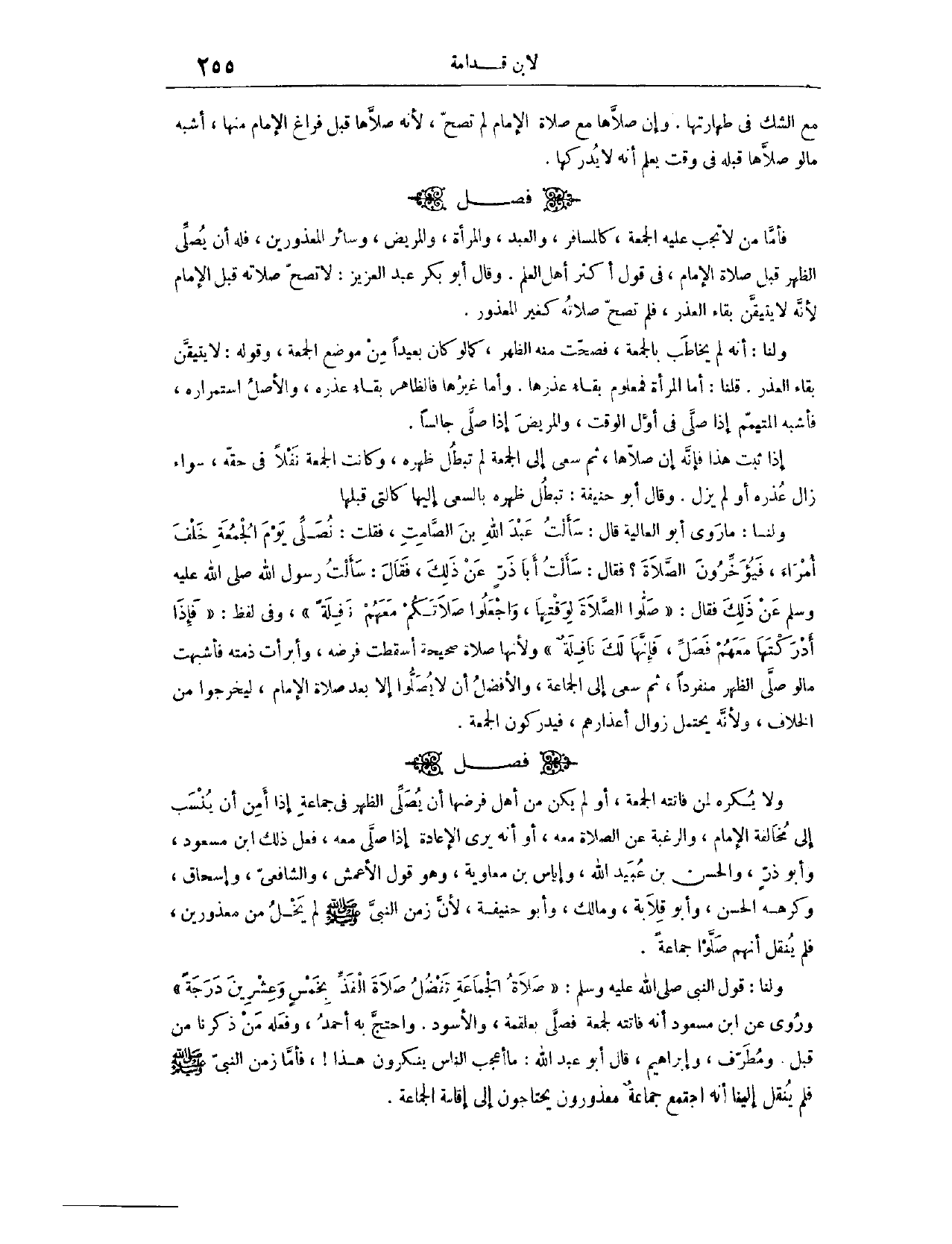 (١٣٦١) فَصْلٌ: فَأَمَّا مَنْ لَا تَجِبُ عَلَيْهِ الْجُمُعَةُ، كَالْمُسَافِرِ، وَالْعَبْدِ، وَالْمَرْأَةِ، وَالْمَرِيضِ، وَسَائِرِ الْمَعْذُورِينَ، فَلَهُ أَنْ يُصَلِّيَ الظُّهْرَ قَبْلَ صَلَاةِ الْإِمَامِ فِي قَوْلِ أَكْثَرِ أَهْلِ الْعِلْمِ. وَقَالَ أَبُو بَكْرٍ عَبْدُ الْعَزِيزِ: لَا تَصِحُّ صَلَاتُهُ قَبْلَ الْإِمَامِ؛ لِأَنَّهُ لَا يَتَيَقَّنُ بَقَاءَ الْعُذْرِ، فَلَمْ تَصِحَّ صَلَاتُهُ كَغَيْرِ الْمَعْذُورِ.