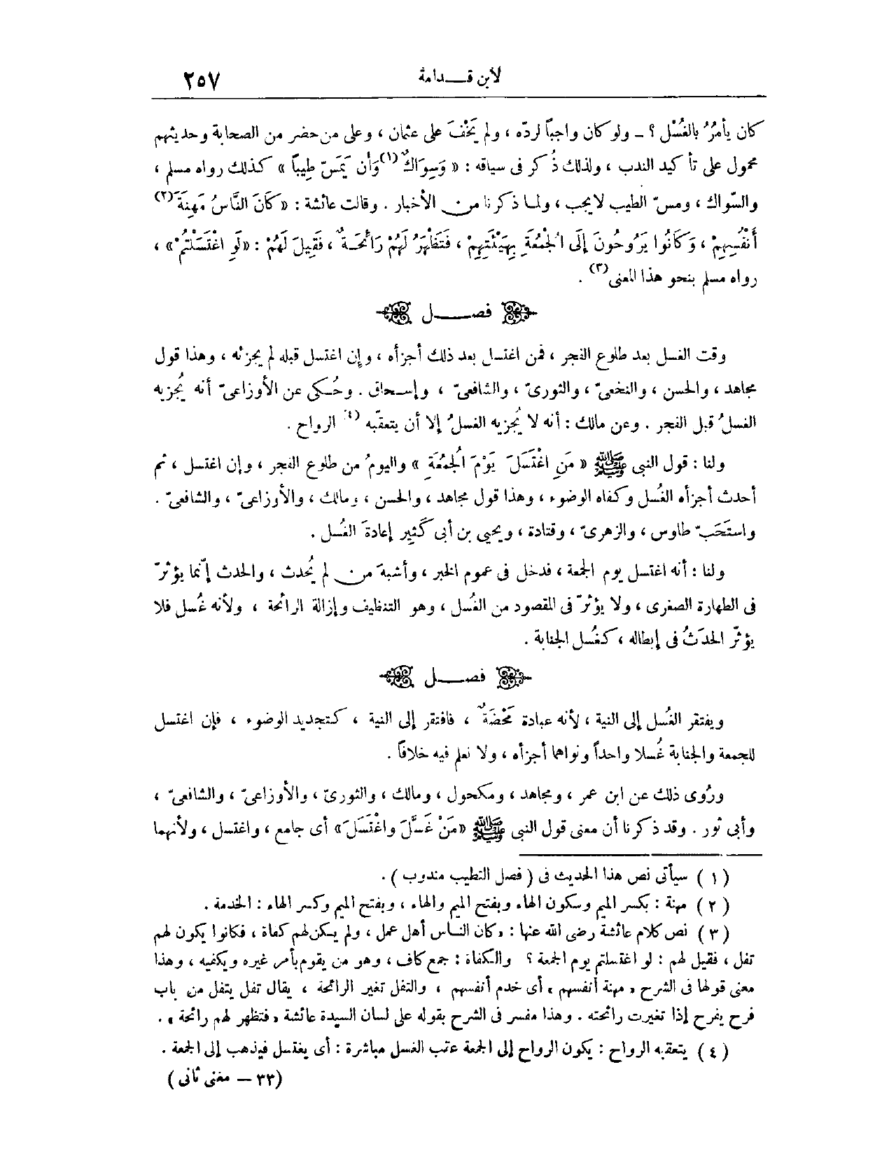 كَانَ يَأْمُرُ بِالْغُسْلِ؟» وَلَوْ كَانَ وَاجِبًا لَرَدَّهُ، وَلَمْ يَخْفَ عَلَى عُثْمَانَ وَعَلَى مَنْ حَضَرَ مِنْ الصَّحَابَةِ، وَحَدِيثُهُمْ مَحْمُولٌ عَلَى تَأْكِيدِ النَّدْبِ، وَلِذَلِكَ ذُكِرَ فِي سِيَاقِهِ: " وَسِوَاكٌ، وَأَنْ يَمَسَّ طِيبًا " كَذَلِكَ رَوَاهُ مُسْلِمٌ. وَالسِّوَاكُ، وَمَسُّ الطِّيبِ، لَا يَجِبُ، وَلِمَا ذَكَرْنَا مِنْ الْأَخْبَارِ، وَقَالَتْ عَائِشَةُ: كَانَ النَّاسُ مَهَنَةَ أَنْفُسِهِمْ، وَكَانُوا يَرُوحُونَ إلَى الْجُمُعَةِ بِهَيْئَتِهِمْ، فَتَظْهَرُ لَهُمْ رَائِحَةٌ، فَقِيلَ لَهُمْ: لَوْ اغْتَسَلْتُمْ. رَوَاهُ مُسْلِمٌ بِنَحْوِ هَذَا الْمَعْنَى (١٣٦٤) فَصْلٌ: وَقْتُ الْغُسْلِ بَعْدَ طُلُوعِ الْفَجْرِ، فَمَنْ اغْتَسَلَ بَعْدَ ذَلِكَ أَجْزَأَهُ، وَإِنْ اغْتَسَلَ قَبْلَهُ لَمْ يُجْزِئْهُ، وَهَذَا قَوْلُ مُجَاهِدٍ، وَالْحَسَنِ، وَالنَّخَعِيِّ، وَالثَّوْرِيِّ، وَالشَّافِعِيِّ، وَإِسْحَاقَ وَحُكِيَ عَنْ الْأَوْزَاعِيِّ أَنَّهُ يُجْزِئُهُ الْغُسْلُ قَبْلَ الْفَجْرِ. وَعَنْ مَالِكٍ: أَنَّهُ لَا يُجْزِئُهُ الْغُسْلُ إلَّا أَنْ يَتَعَقَّبَهُ الرَّوَاحُ. وَلَنَا، قَوْلُ النَّبِيِّ - صَلَّى اللَّهُ عَلَيْهِ وَسَلَّمَ -: «مَنْ اغْتَسَلَ يَوْمَ الْجُمُعَةِ» وَالْيَوْمُ مِنْ طُلُوعِ الْفَجْرِ، وَإِنْ اغْتَسَلَ، ثُمَّ أَحْدَثَ، أَجْزَأَهُ الْغُسْلُ، وَكَفَاهُ الْوُضُوءُ، وَهَذَا قَوْلُ مُجَاهِدٍ، وَالْحَسَنِ، وَمَالِكٍ، وَالْأَوْزَاعِيِّ، وَالشَّافِعِيِّ. وَاسْتَحَبَّ طَاوُسٌ وَالزُّهْرِيُّ، وَقَتَادَةُ، وَيَحْيَى بْنُ أَبِي كَثِيرٍ، إعَادَةَ الْغُسْلِ.