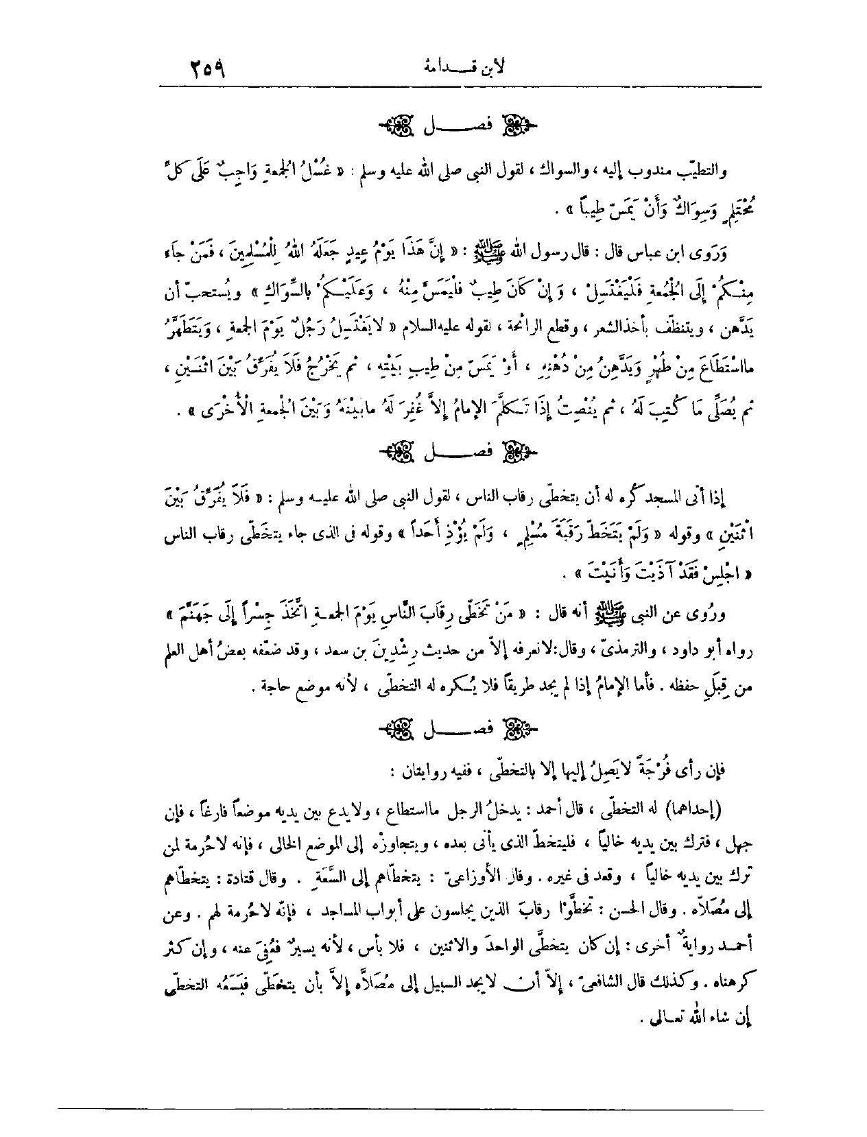 (١٣٦٩) فَصْلٌ: إذَا أَتَى الْمَسْجِدَ كُرِهَ لَهُ أَنْ يَتَخَطَّى رِقَابَ النَّاسِ، لِقَوْلِ النَّبِيِّ - صَلَّى اللَّهُ عَلَيْهِ وَسَلَّمَ -: «فَلَا يُفَرِّقُ بَيْنَ اثْنَيْنِ.» وَقَوْلِهِ: «وَلَمْ يَتَخَطَّ رَقَبَةَ مُسْلِمٍ، وَلَمْ يُؤْذِ أَحَدًا» . وَقَوْلِهِ فِي الَّذِي جَاءَ يَتَخَطَّى رِقَابَ النَّاسِ يَوْمَ الْجُمُعَةِ: «اجْلِسْ، فَقَدْ آذَيْتَ وَآنَيْتَ» وَرُوِيَ عَنْ النَّبِيِّ - صَلَّى اللَّهُ عَلَيْهِ وَسَلَّمَ - أَنَّهُ قَالَ: «مَنْ تَخَطَّى رِقَابَ النَّاسِ يَوْمَ الْجُمُعَةِ اتَّخَذَ جِسْرًا إلَى جَهَنَّمَ» . رَوَاهُ أَبُو دَاوُد، وَالتِّرْمِذِيُّ، وَقَالَ: لَا نَعْرِفُهُ إلَّا مِنْ حَدِيثِ رِشْدِينَ بْنِ سَعْدٍ، وَقَدْ ضَعَّفَهُ بَعْضُ أَهْلِ الْعِلْمِ مِنْ قِبَلِ حِفْظِهِ،