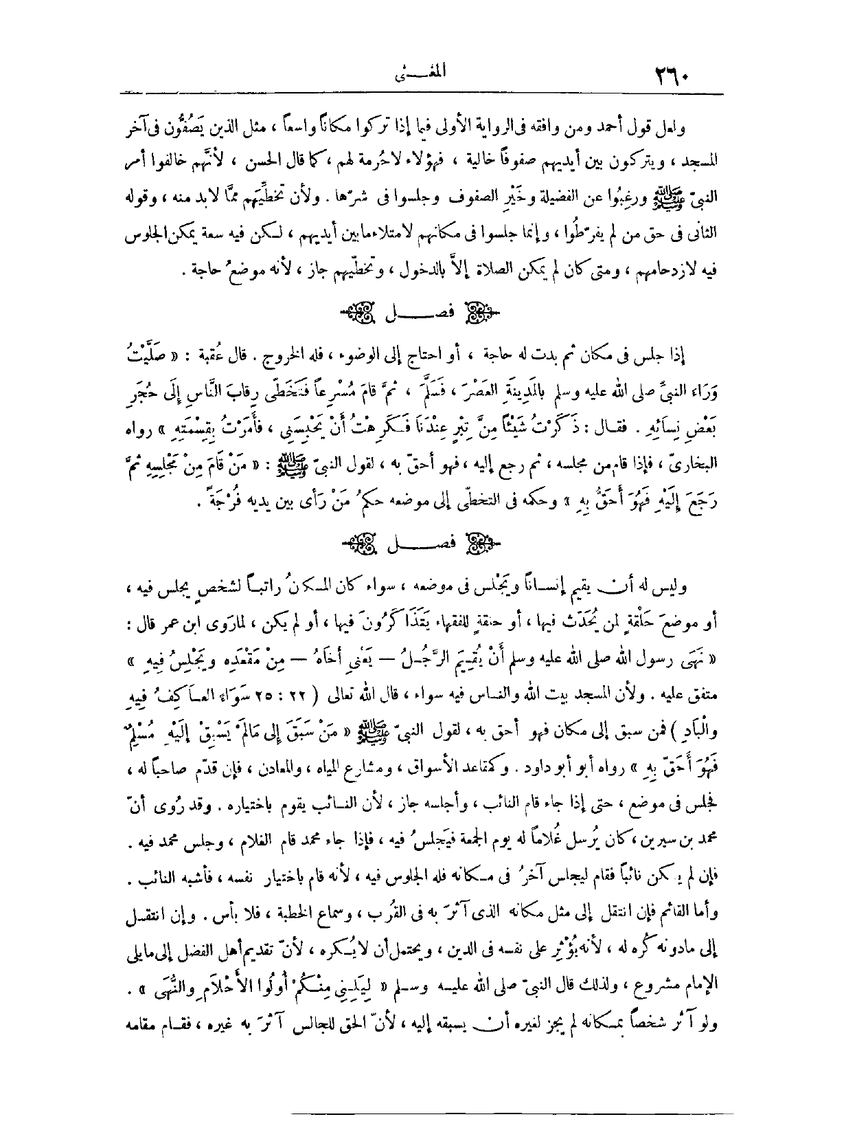 وَحُكْمُهُ فِي التَّخَطِّي إلَى مَوْضِعِهِ حُكْمُ مَنْ رَأَى بَيْنَ يَدَيْهِ فُرْجَةً. (١٣٧٢) فَصْلٌ: وَلَيْسَ لَهُ أَنْ يُقِيمَ إنْسَانًا وَيَجْلِسَ فِي مَوْضِعِهِ، سَوَاءٌ كَانَ الْمَكَانُ رَاتِبًا لِشَخْصٍ يَجْلِسُ فِيهِ، أَوْ مَوْضِعَ حَلْقَةٍ لِمَنْ يُحَدِّثُ فِيهَا، أَوْ حَلْقَةً لِلْفُقَهَاءِ يَتَذَاكَرُونَ فِيهَا، أَوْ لَمْ يَكُنْ؛ لِمَا رَوَى ابْنُ عُمَرَ، قَالَ: «نَهَى رَسُولُ اللَّهِ - صَلَّى اللَّهُ عَلَيْهِ وَسَلَّمَ - أَنْ يُقِيمَ الرَّجُلُ - يَعْنِي أَخَاهُ - مِنْ مَقْعَدِهِ، وَيَجْلِسَ فِيهِ.» مُتَّفَقٌ عَلَيْهِ.