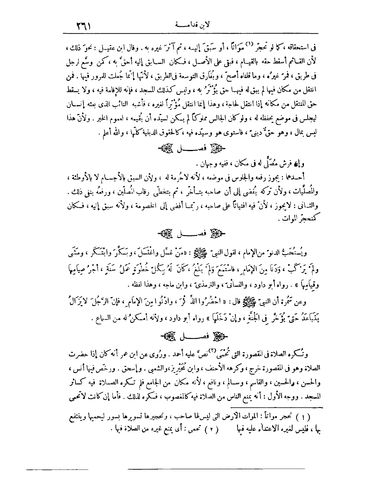 (١٣٧٣) فَصْلٌ: وَإِنْ فَرَشَ مُصَلَّى لَهُ فِي مَكَان، فَفِيهِ وَجْهَانِ: أَحَدُهُمَا، يَجُوزُ رَفْعُهُ، وَالْجُلُوسُ فِي مَوْضِعِهِ، لِأَنَّهُ لَا حُرْمَةَ لَهُ، وَلِأَنَّ السَّبْقَ بِالْأَجْسَامِ، لَا بِالْأَوْطِئَةِ وَالْمُصَلَّيَاتِ، وَلِأَنَّ تَرْكَهُ يُفْضِي إلَى أَنَّ صَاحِبَهُ يَتَأَخَّرُ، ثُمَّ يَتَخَطَّى رِقَابَ الْمُصَلِّينَ، وَرَفْعُهُ يَنْفِي ذَلِكَ وَالثَّانِي: لَا يَجُوزُ؛ لِأَنَّ؛ فِيهِ افْتِيَاتًا عَلَى صَاحِبِهِ، رُبَّمَا أَفْضَى إلَى الْخُصُومَةِ، وَلِأَنَّهُ سَبَقَ إلَيْهِ، فَكَانَ كَمُحْتَجِرِ الْمَوَاتِ.