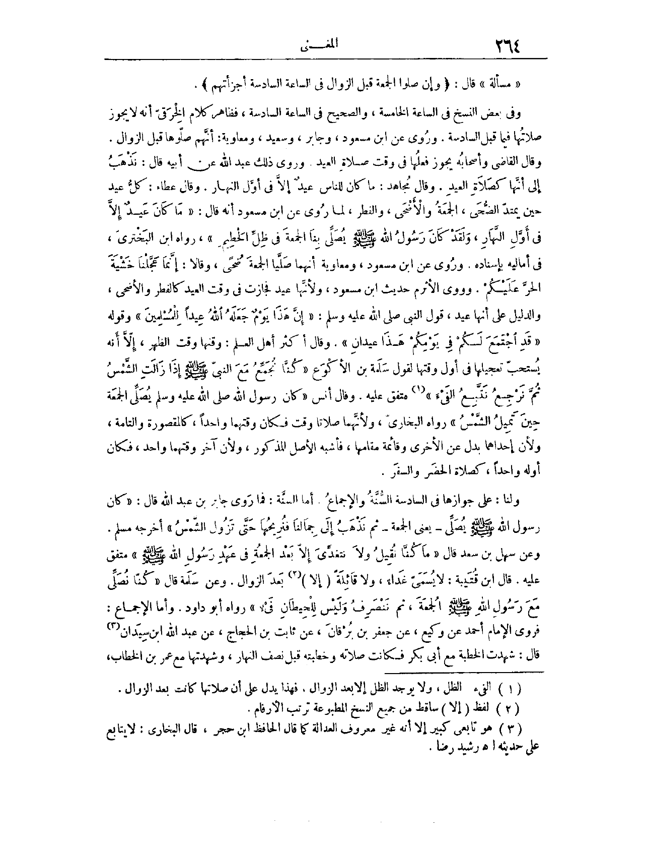 (١٣٨٠) مَسْأَلَةٌ: قَالَ: (وَإِنْ صَلَّوْا الْجُمُعَةَ قَبْلَ الزَّوَالِ فِي السَّاعَةِ السَّادِسَةِ، أَجْزَأَتْهُمْ) وَفِي بَعْضِ النُّسَخِ، فِي السَّاعَةِ الْخَامِسَةِ. وَالصَّحِيحُ فِي السَّاعَةِ السَّادِسَةِ. وَظَاهِرُ كَلَامِ الْخِرَقِيِّ أَنَّهُ لَا يَجُوزُ صَلَاتُهَا فِيمَا قَبْلَ السَّادِسَةِ. وَرُوِيَ عَنْ ابْنِ مَسْعُودٍ، وَجَابِرٍ، وَسَعِيدٍ، وَمُعَاوِيَةَ، أَنَّهُمْ صَلَّوْهَا قَبْلَ الزَّوَالِ. وَقَالَ الْقَاضِي، وَأَصْحَابُهُ: يَجُوزُ فِعْلُهَا فِي وَقْتِ صَلَاةِ الْعِيدِ.