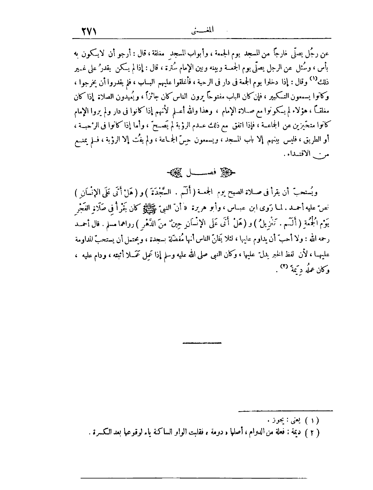 (١٣٩٣) فَصْلٌ: وَيُسْتَحَبُّ أَنْ يَقْرَأَ فِي صَلَاةِ الصُّبْحِ يَوْمَ الْجُمُعَةِ " الم " وَ " هَلْ أَتَى عَلَى الْإِنْسَانِ " نَصَّ عَلَيْهِ أَحْمَدُ؛ لِمَا رَوَى ابْنُ عَبَّاسٍ، وَأَبُو هُرَيْرَةَ، «أَنَّ النَّبِيَّ - صَلَّى اللَّهُ عَلَيْهِ وَسَلَّمَ - كَانَ يَقْرَأُ فِي صَلَاةِ الْفَجْرِ يَوْمَ الْجُمُعَةِ أَلَمْ تَنْزِيلُ وَهَلْ أَتَى عَلَى الْإِنْسَانِ حِينٌ مِنْ الدَّهْرِ» رَوَاهُمَا مُسْلِمٌ. قَالَ أَحْمَدُ، - رَحِمَهُ اللَّهُ -: وَلَا أُحِبُّ أَنْ يُدَاوِمَ عَلَيْهَا، لِئَلَّا يَظُنَّ النَّاسُ أَنَّهَا مُفَضَّلَةٌ بِسَجْدَةٍ.