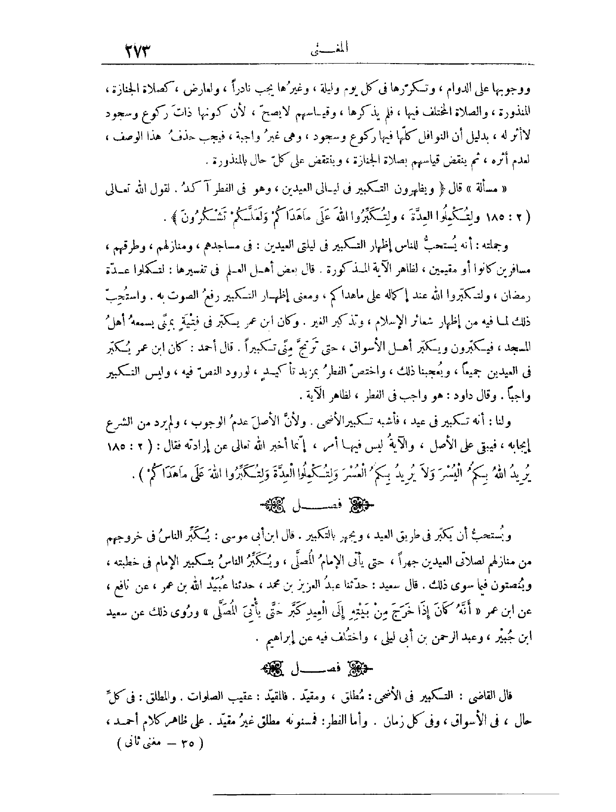 قَالَ سَعِيدٌ: حَدَّثَنَا عَبْدُ الْعَزِيزِ بْنُ مُحَمَّدٍ، حَدَّثَنَا عُبَيْدُ اللَّهِ بْنُ عُمَرَ، عَنْ نَافِعٍ، عَنْ ابْنِ عُمَرَ أَنَّهُ كَانَ إذَا خَرَجَ مِنْ بَيْتِهِ إلَى الْعِيدِ كَبَّرَ حَتَّى يَأْتِيَ الْمُصَلَّى. وَرُوِيَ ذَلِكَ عَنْ سَعِيدِ بْنِ جُبَيْرٍ، وَعَبْدِ الرَّحْمَنِ بْنِ أَبِي لَيْلَى، وَاخْتُلِفَ فِيهِ عَنْ إبْرَاهِيمَ (١٣٩٦) فَصْلٌ: قَالَ الْقَاضِي: التَّكْبِيرُ فِي الْأَضْحَى مُطْلَقٌ وَمُقَيَّدٌ؛ فَالْمُقَيَّدُ عَقِيبَ الصَّلَوَاتِ.