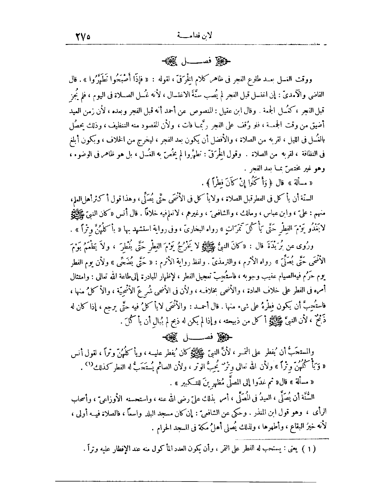 (١٤٠٠) مَسْأَلَةٌ: قَالَ: (وَأَكَلُوا إنْ كَانَ فِطْرًا) السُّنَّةُ أَنْ يَأْكُلَ فِي الْفِطْرِ قَبْلَ الصَّلَاةِ، وَلَا يَأْكُلَ فِي الْأَضْحَى حَتَّى يُصَلِّيَ. وَهَذَا قَوْلُ أَكْثَرِ أَهْلِ الْعِلْمِ؛ مِنْهُمْ عَلِيٌّ، وَابْنُ عَبَّاسٍ، وَمَالِكٌ وَالشَّافِعِيُّ وَغَيْرُهُمْ، لَا نَعْلَمُ فِيهِ خِلَافًا قَالَ: أَنَسٌ: «كَانَ النَّبِيُّ - صَلَّى اللَّهُ عَلَيْهِ وَسَلَّمَ - لَا يَغْدُو يَوْمَ الْفِطْرِ حَتَّى يَأْكُلَ تَمَرَاتٍ» . رَوَاهُ الْبُخَارِيُّ. وَفِي رِوَايَةٍ اسْتَشْهَدَ بِهَا: " وَيَأْكُلُهُنَّ وِتْرًا ".