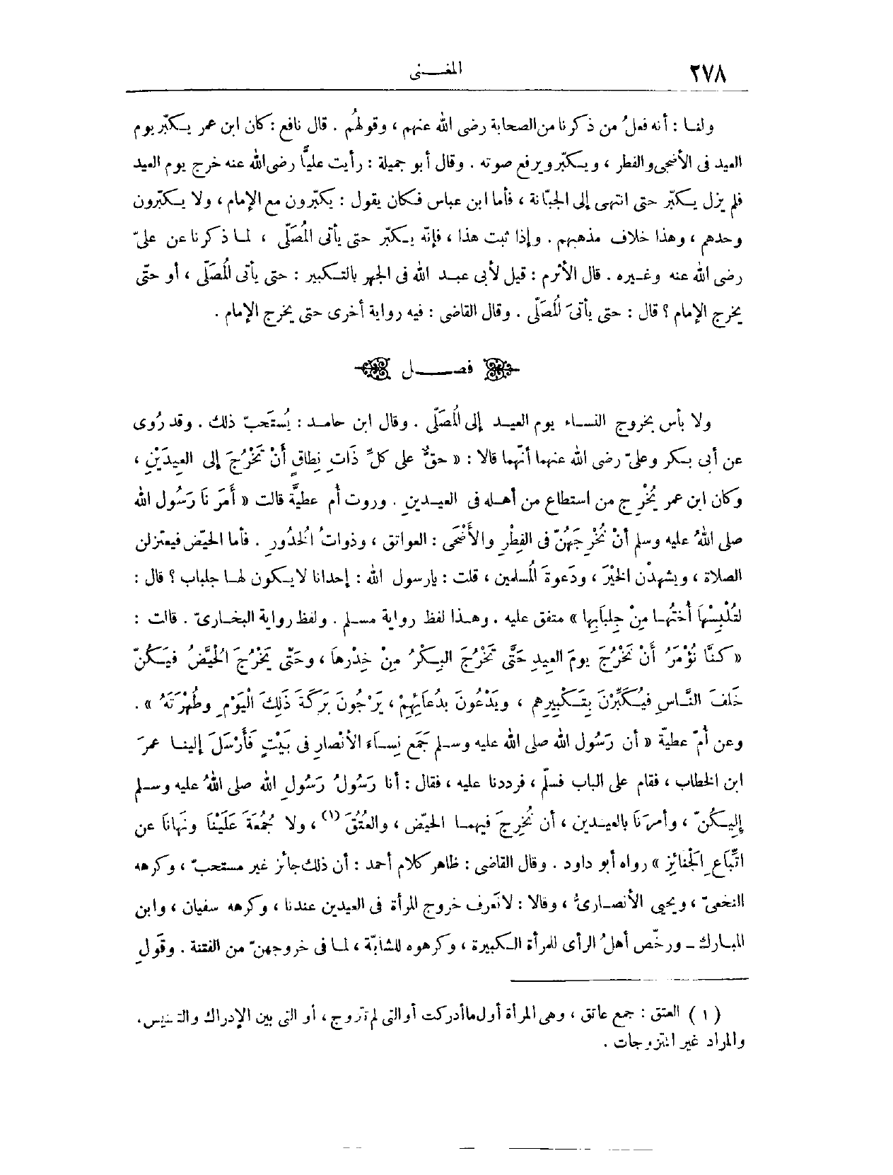 (١٤٠٨) فَصْلٌ: وَلَا بَأْسَ بِخُرُوجِ النِّسَاءِ يَوْمَ الْعِيدِ إلَى الْمُصَلَّى. وَقَالَ ابْنُ حَامِدٍ: يُسْتَحَبُّ ذَلِكَ. وَقَدْ رُوِيَ عَنْ أَبِي بَكْرٍ، وَعَلِيٍّ - رَضِيَ اللَّهُ عَنْهُمَا -، أَنَّهُمَا قَالَا: حَقٌّ عَلَى كُلِّ ذَاتِ نِطَاقٍ أَنْ تَخْرُجَ إلَى الْعِيدَيْنِ. وَكَانَ ابْنُ عُمَرَ يُخْرِجُ مَنْ اسْتَطَاعَ مِنْ أَهْلِهِ فِي الْعِيدَيْنِ.
