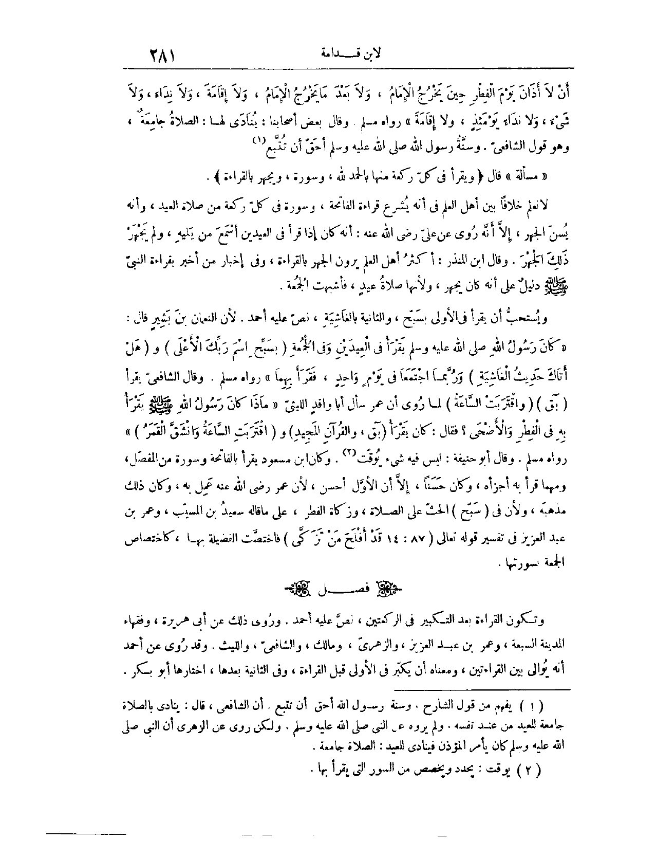 وَسُنَّةُ رَسُولِ اللَّهِ - صَلَّى اللَّهُ عَلَيْهِ وَسَلَّمَ - أَحَقُّ أَنْ تُتَّبَعَ. (١٤١٢) مَسْأَلَةٌ: قَالَ: (وَيَقْرَأُ فِي كُلِّ رَكْعَةٍ مِنْهَا بِ " الْحَمْدُ لِلَّهِ " وَسُورَةٍ، وَيَجْهَرُ بِالْقِرَاءَةِ) لَا نَعْلَمُ خِلَافًا بَيْنَ أَهْلِ الْعِلْمِ فِي أَنَّهُ يُشْرَعُ قِرَاءَةُ الْفَاتِحَةِ وَسُورَةٍ فِي كُلِّ رَكْعَةٍ مِنْ صَلَاةِ الْعِيدِ، وَأَنَّهُ يُسَنُّ الْجَهْرُ، إلَّا أَنَّهُ رُوِيَ عَنْ عَلِيٍّ - رَضِيَ اللَّهُ عَنْهُ - أَنَّهُ كَانَ إذَا قَرَأَ فِي الْعِيدَيْنِ أَسْمَعَ مَنْ يَلِيهِ، وَلَمْ يَجْهَرْ ذَلِكَ الْجَهْرَ.