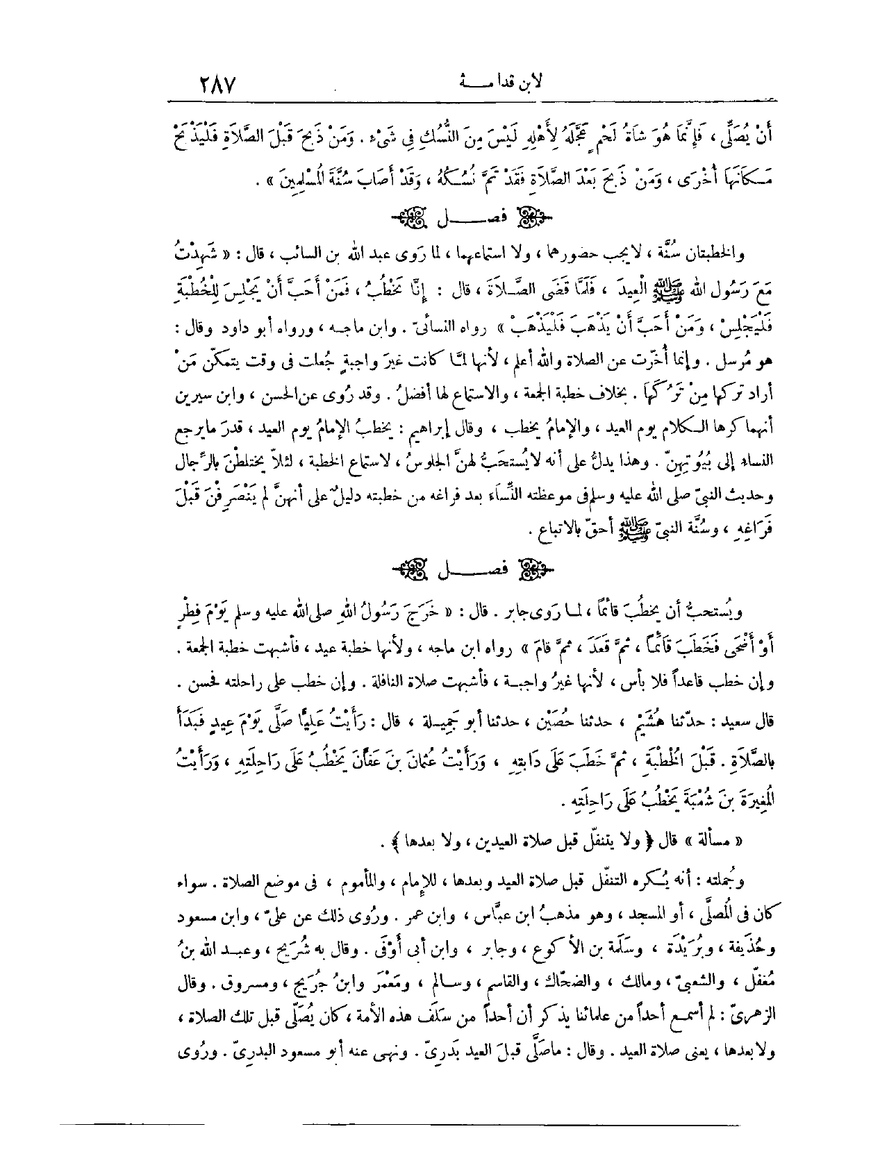 أَنْ يُصَلِّيَ فَإِنَّمَا هُوَ شَاةُ لَحْمٍ عَجَّلَهُ لِأَهْلِهِ، لَيْسَ مِنْ النُّسُكِ فِي شَيْءٍ، وَمَنْ ذَبَحَ قَبْلَ الصَّلَاةِ فَلْيَذْبَحْ مَكَانَهَا أُخْرَى، وَمَنْ ذَبَحَ بَعْدَ الصَّلَاةِ فَقَدْ تَمَّ نُسُكُهُ وَقَدْ أَصَابَ سُنَّةَ الْمُسْلِمِينَ» . (١٤٢٠) فَصْلٌ: وَالْخُطْبَتَانِ سُنَّةٌ، لَا يَجِبُ حُضُورُهَا وَلَا اسْتِمَاعُهَا؛ لِمَا رَوَى عَبْدُ اللَّهِ بْنُ السَّائِبِ قَالَ: «شَهِدْتُ مَعَ رَسُولِ اللَّهِ - صَلَّى اللَّهُ عَلَيْهِ وَسَلَّمَ - الْعِيدَ، فَلَمَّا قَضَى الصَّلَاةَ، قَالَ: إنَّا نَخْطُبُ فَمَنْ أَحَبَّ أَنْ يَجْلِسَ لِلْخُطْبَةِ فَلْيَجْلِسْ، وَمَنْ أَحَبَّ أَنْ يَذْهَبَ فَلْيَذْهَبْ» . رَوَاهُ النَّسَائِيّ، وَابْنُ مَاجَهْ، وَرَوَاهُ أَبُو دَاوُد، وَقَالَ: هُوَ مُرْسَلٌ.