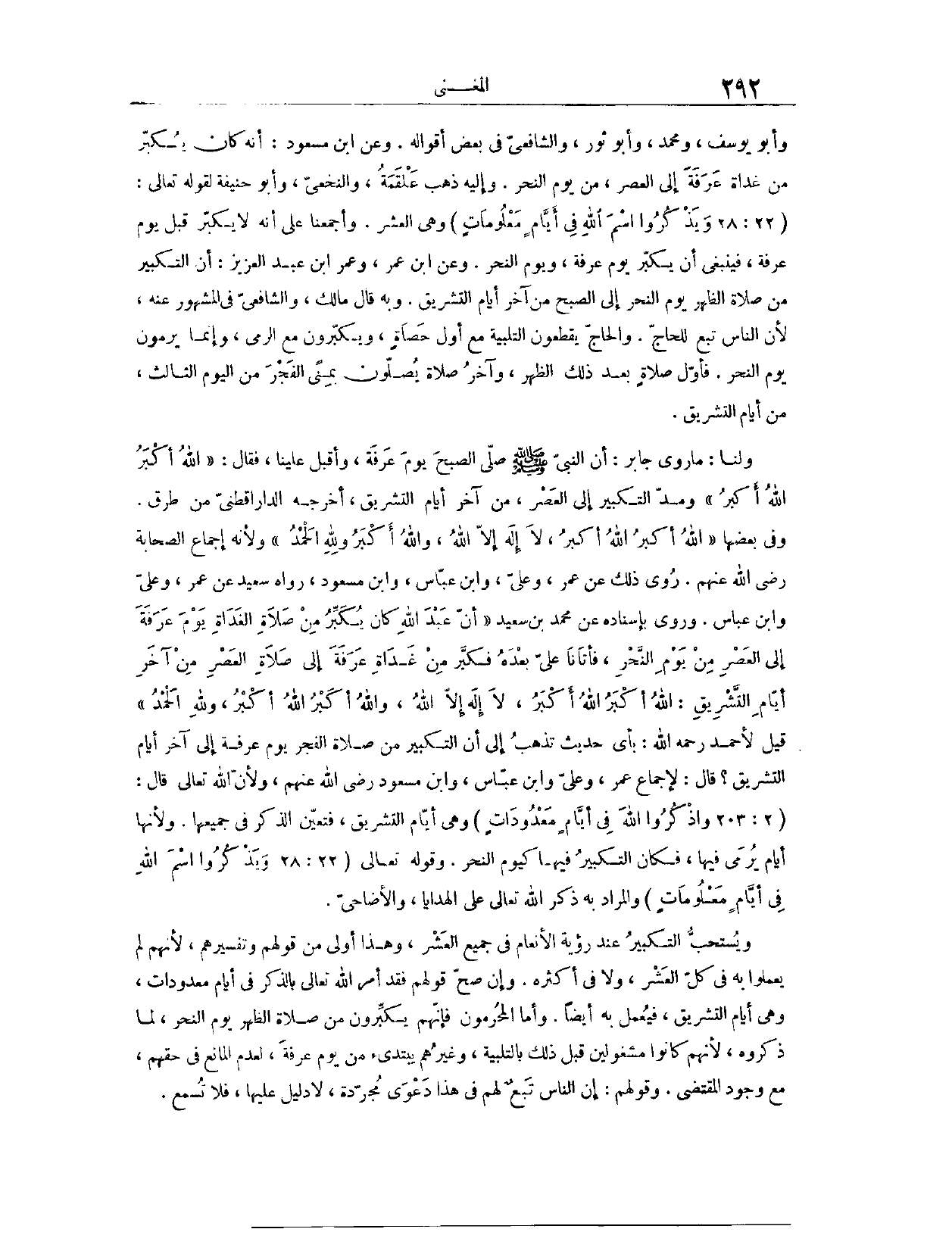 قِيلَ لِأَحْمَدْ، - رَحِمَهُ اللَّهُ -: بِأَيِّ حَدِيثٍ تَذْهَبُ، إلَى أَنَّ التَّكْبِيرَ مِنْ صَلَاةِ الْفَجْرِ يَوْمَ عَرَفَةَ إلَى آخِرِ أَيَّامِ التَّشْرِيقِ؟ قَالَ: بِالْإِجْمَاعِ عُمَرُ، وَعَلِيٌّ، وَابْنُ عَبَّاسٍ، وَابْنُ مَسْعُودٍ - رَضِيَ اللَّهُ عَنْهُمْ -. وَلِأَنَّ اللَّهَ تَعَالَى قَالَ: {وَاذْكُرُوا اللَّهَ فِي أَيَّامٍ مَعْدُودَاتٍ} [البقرة: ٢٠٣] . وَهِيَ أَيَّامُ التَّشْرِيقِ، فَتَعَيَّنَ الذِّكْرُ فِي جَمِيعِهَا. وَلِأَنَّهَا أَيَّامٌ يُرْمَى فِيهَا، فَكَانَ التَّكْبِيرُ فِيهَا كَيَوْمِ النَّحْرِ. وقَوْله تَعَالَى: {وَيَذْكُرُوا اسْمَ اللَّهِ فِي أَيَّامٍ مَعْلُومَاتٍ} [الحج: ٢٨] .