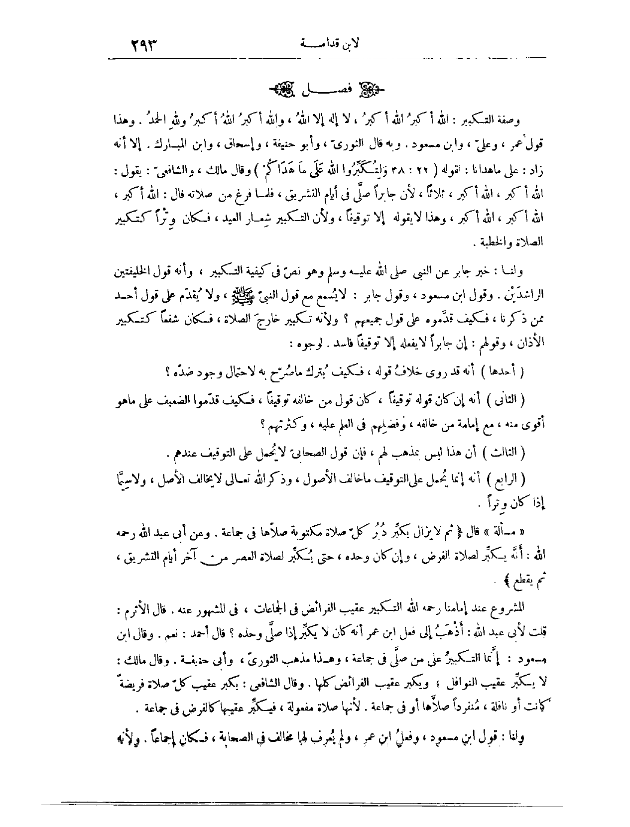 وَهَذَا مَذْهَبُ الثَّوْرِيِّ، وَأَبِي حَنِيفَةَ. وَقَالَ مَالِكٌ: لَا يُكَبِّرُ عَقِيبَ النَّوَافِلِ، وَيُكَبِّرُ عَقِيبَ الْفَرَائِضِ كُلِّهَا. وَقَالَ الشَّافِعِيُّ: يُكَبِّرُ عَقِيبَ كُلِّ صَلَاةٍ، فَرِيضَةً كَانَتْ، أَوْ نَافِلَةً، مُنْفَرِدًا صَلَّاهَا، أَوْ فِي جَمَاعَةٍ؛ لِأَنَّهَا صَلَاةٌ مَفْعُولَةٌ، فَيُكَبِّرُ عَقِيبَهَا، كَالْفَرْضِ فِي جَمَاعَةٍ. وَلَنَا، قَوْلُ ابْنِ مَسْعُودٍ، وَفِعْلُ ابْنِ عُمَرَ، وَلَمْ يُعْرَفْ لَهُمَا مُخَالِفٌ فِي الصَّحَابَةِ - رَضِيَ اللَّهُ عَنْهُمْ -، فَكَانَ إجْمَاعًا. وَلِأَنَّهُ