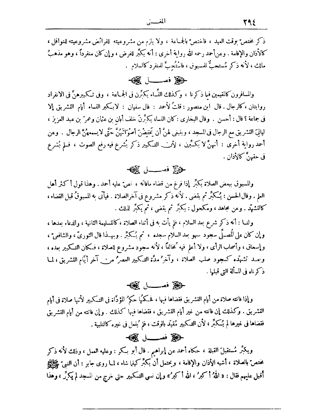 (١٤٣٤) فَصْلٌ: وَالْمُسَافِرُونَ كَالْمُقِيمِينَ، فِيمَا ذَكَرْنَا، وَكَذَلِكَ النِّسَاءُ يُكَبِّرْنَ فِي الْجَمَاعَةِ، وَفِي تَكْبِيرِهِنَّ فِي الِانْفِرَادِ رِوَايَتَانِ كَالرِّجَالِ. قَالَ ابْنُ مَنْصُورٍ: قُلْت لِأَحْمَدَ، قَالَ سُفْيَانُ: لَا يُكَبِّرُ النِّسَاءُ أَيَّامَ التَّشْرِيقِ إلَّا فِي جَمَاعَةٍ. قَالَ: أَحْسَنُ. وَقَالَ الْبُخَارِيُّ: كَانَ النِّسَاءُ يُكَبِّرْنَ خَلْفَ أَبَانَ بْنِ عُثْمَانَ وَعُمَرَ بْنِ عَبْدِ الْعَزِيزِ لَيَالِيَ التَّشْرِيقِ مَعَ الرِّجَالِ فِي الْمَسْجِدِ. وَيَنْبَغِي لَهُنَّ أَنْ يَخْفِضْنَ أَصْوَاتَهُنَّ، حَتَّى لَا يَسْمَعَهُنَّ الرِّجَالُ.