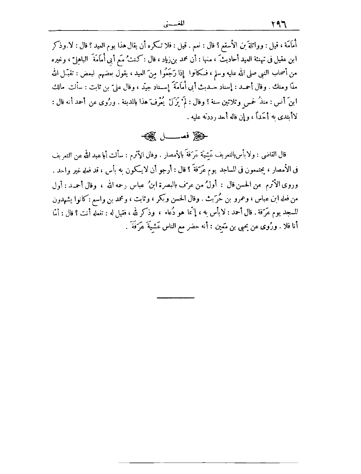 (١٤٤١) فَصْلٌ: قَالَ الْقَاضِي: وَلَا بَأْسَ بِالتَّعْرِيفِ عَشِيَّةَ عَرَفَةَ بِالْأَمْصَارِ. وَقَالَ الْأَثْرَمُ: سَأَلْت أَبَا عَبْدِ اللَّهِ عَنْ التَّعْرِيفِ فِي الْأَمْصَارِ، يَجْتَمِعُونَ فِي الْمَسَاجِدِ يَوْمَ عَرَفَةَ، قَالَ: أَرْجُو أَنْ لَا يَكُونَ بِهِ بَأْسٌ، قَدْ فَعَلَهُ غَيْرُ وَاحِدٍ.