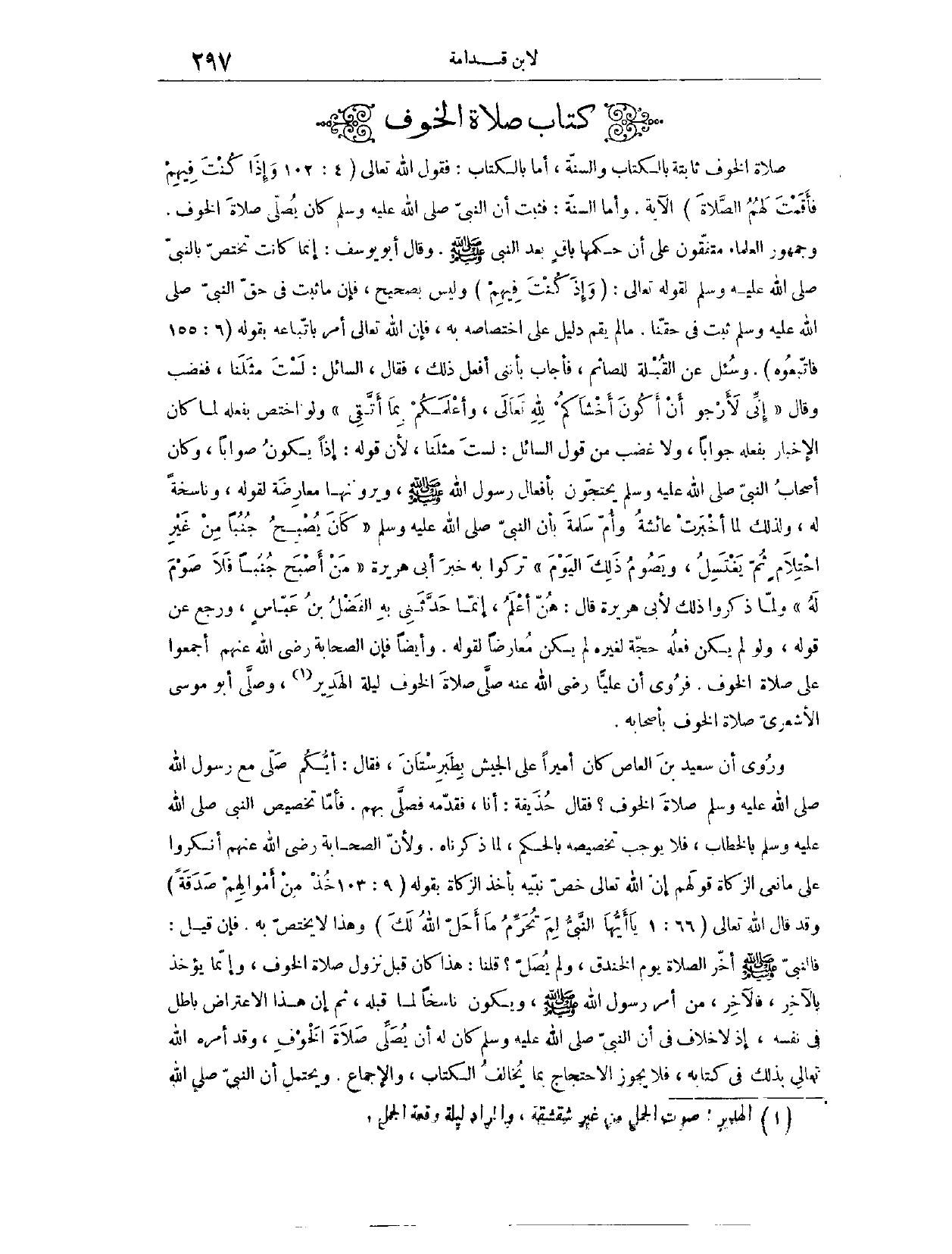 ِ صَلَاةُ الْخَوْفِ ثَابِتَةٌ بِالْكِتَابِ وَالسُّنَّةِ؛ أَمَّا الْكِتَابُ فَقَوْلُ اللَّهِ تَعَالَى: {وَإِذَا كُنْتَ فِيهِمْ فَأَقَمْتَ لَهُمُ الصَّلاةَ} [النساء: ١٠٢] الْآيَةُ. وَأَمَّا السُّنَّةُ فَثَبَتَ أَنَّ النَّبِيَّ - صَلَّى اللَّهُ عَلَيْهِ وَسَلَّمَ - «كَانَ يُصَلِّي صَلَاةَ الْخَوْفِ» ، وَجُمْهُورُ الْعُلَمَاءِ مُتَّفِقُونَ عَلَى أَنَّ حُكْمَهَا بَاقٍ بَعْدَ النَّبِيِّ - صَلَّى اللَّهُ عَلَيْهِ وَسَلَّمَ -. وَقَالَ أَبُو يُوسُفَ: إنَّمَا كَانَتْ تَخْتَصُّ بِالنَّبِيِّ - صَلَّى اللَّهُ عَلَيْهِ وَسَلَّمَ -؛ لِقَوْلِهِ تَعَالَى: {وَإِذَا كُنْتَ فِيهِمْ} [النساء: ١٠٢] .