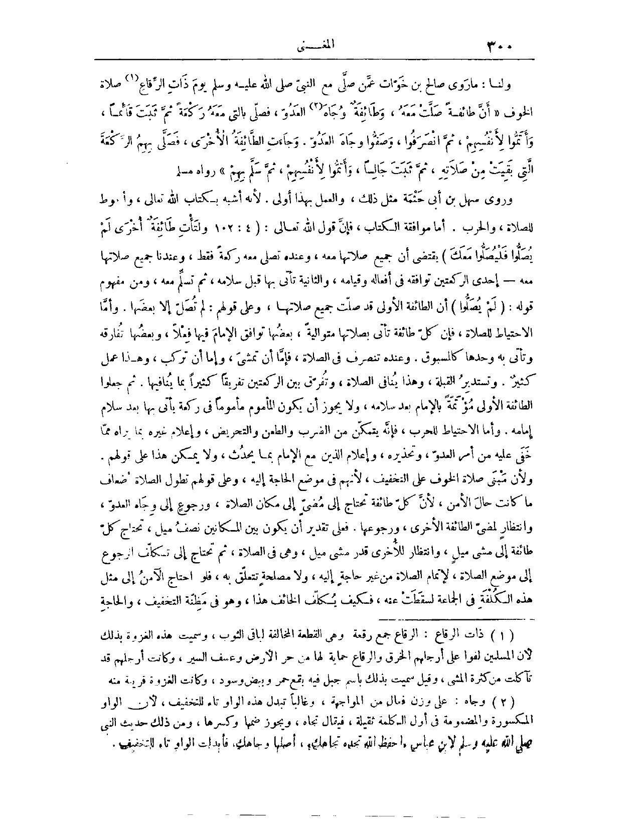 وَلَنَا، مَا رَوَى «صَالِحُ بْنُ خَوَّاتٍ، عَمَّنْ صَلَّى مَعَ النَّبِيِّ - صَلَّى اللَّهُ عَلَيْهِ وَسَلَّمَ - يَوْمَ ذَاتِ الرِّقَاعِ صَلَاةَ الْخَوْفِ، أَنَّ طَائِفَةً صَفَّتْ مَعَهُ، وَطَائِفَةً وِجَاهَ الْعَدُوِّ، فَصَلَّى بِاَلَّتِي مَعَهُ رَكْعَةً، ثُمَّ ثَبَتَ قَائِمًا، وَأَتَمُّوا لِأَنْفُسِهِمْ، ثُمَّ انْصَرَفُوا وَصَفُّوا وِجَاهَ الْعَدُوِّ، وَجَاءَتْ الطَّائِفَةُ الْأُخْرَى، فَصَلَّى بِهِمْ الرَّكْعَةَ الَّتِي بَقِيَتْ مِنْ صَلَاتِهِ، ثُمَّ ثَبَتَ جَالِسًا، وَأَتَمُّوا لِأَنْفُسِهِمْ، ثُمَّ سَلَّمَ بِهِمْ.» رَوَاهُ مُسْلِمٌ وَرَوَى سَهْلُ بْنُ أَبِي حَثْمَةَ مِثْلَ ذَلِكَ، وَالْعَمَلُ بِهَذَا أَوْلَى؛ لِأَنَّهُ أَشْبَهُ بِكِتَابِ اللَّهِ تَعَالَى، وَأَحْوَطُ لِلصَّلَاةِ وَالْحَرْبِ.