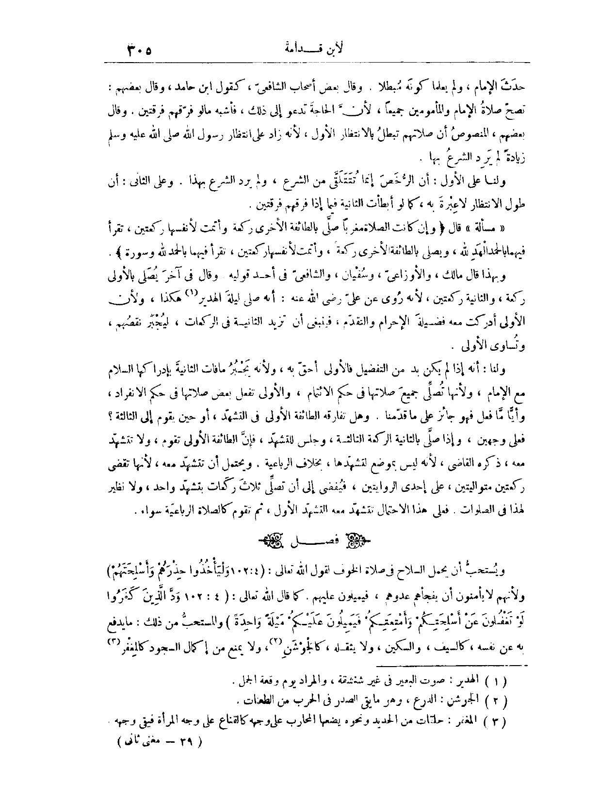وَهَلْ تُفَارِقُهُ الطَّائِفَةُ الْأُولَى فِي التَّشَهُّدِ، أَوْ حِينَ يَقُومُ إلَى الثَّالِثَةِ؟ عَلَى وَجْهَيْنِ. وَإِذَا صَلَّى بِالثَّانِيَةِ الرَّكْعَةَ الثَّالِثَةَ، وَجَلَسَ لِلتَّشَهُّدِ، فَإِنَّ الطَّائِفَةَ تَقُومُ وَلَا تَتَشَهَّدُ مَعَهُ. ذَكَرَهُ الْقَاضِي؛ لِأَنَّهُ لَيْسَ بِمَوْضِعٍ لِتَشَهُّدِهَا، بِخِلَافِ الرُّبَاعِيَّةِ.