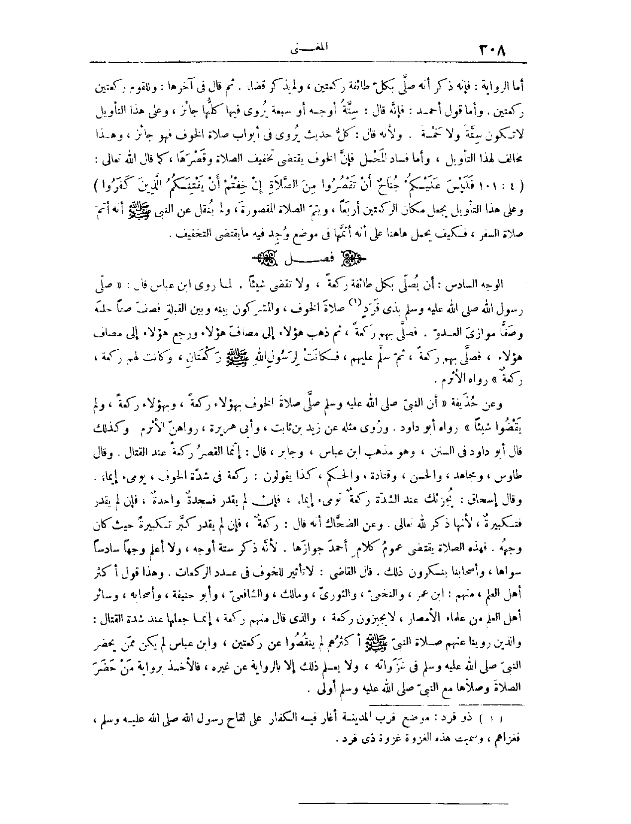 (١٤٥٦) فَصْلٌ: الْوَجْهُ السَّادِسُ، أَنْ يُصَلِّيَ بِكُلِّ طَائِفَةٍ رَكْعَةً، وَلَا تَقْضِي شَيْئًا؛ لِمَا رَوَى ابْنُ عَبَّاسٍ، قَالَ: «صَلَّى رَسُولُ اللَّهِ - صَلَّى اللَّهُ عَلَيْهِ وَسَلَّمَ - بِذِي قَرَدٍ صَلَاةَ الْخَوْفِ، وَالْمُشْرِكُونَ بَيْنَهُ وَبَيْنَ الْقِبْلَةِ، فَصَفَّ صَفًّا خَلْفَهُ، وَصَفًّا مُوَازِيَ الْعَدُوِّ، فَصَلَّى بِهِمْ رَكْعَةً، ثُمَّ ذَهَبَ هَؤُلَاءِ إلَى مَصَافِّ هَؤُلَاءِ، وَرَجَعَ هَؤُلَاءِ إلَى مَصَافِّ هَؤُلَاءِ، فَصَلَّى بِهِمْ رَكْعَةً، ثُمَّ سَلَّمَ عَلَيْهِمْ، فَكَانَتْ لِرَسُولِ اللَّهِ - صَلَّى اللَّهُ عَلَيْهِ وَسَلَّمَ - رَكْعَتَانِ، وَكَانَتْ لَهُمْ رَكْعَةٌ رَكْعَةٌ.» رَوَاهُ. الْأَثْرَمُ