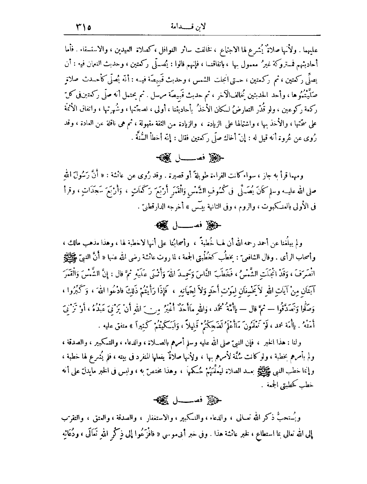 ثُمَّ حَدِيثُ قَبِيصَةَ مُرْسَلٌ. ثُمَّ يَحْتَمِلُ أَنَّهُ صَلَّى رَكْعَتَيْنِ فِي كُلِّ رَكْعَةٍ رُكُوعَيْنِ، وَلَوْ قُدِّرَ التَّعَارُضُ لَكَانَ الْأَخْذُ بِأَحَادِيثِنَا أَوْلَى؛ لِصِحَّتِهَا وَشُهْرَتِهَا، وَاتِّفَاقِ الْأَئِمَّةِ عَلَى صِحَّتِهَا، وَالْأَخْذِ بِهَا، وَاشْتِمَالِهَا عَلَى الزِّيَادَةِ، وَالزِّيَادَةُ مِنْ الثِّقَةِ مَقْبُولَةٌ، ثُمَّ هِيَ نَافِلَةٌ عَنْ الْعَادَةِ، وَقَدْ رُوِيَ عَنْ عُرْوَةَ أَنَّهُ قِيلَ لَهُ: إنَّ أَخَاك صَلَّى رَكْعَتَيْنِ. فَقَالَ: إنَّهُ أَخْطَأَ السُّنَّةَ. (١٤٦٥) فَصْلٌ: وَمَهْمَا قَرَأَ بِهِ جَازَ سَوَاءٌ كَانَتْ الْقِرَاءَةُ طَوِيلَةً أَوْ قَصِيرَةً.