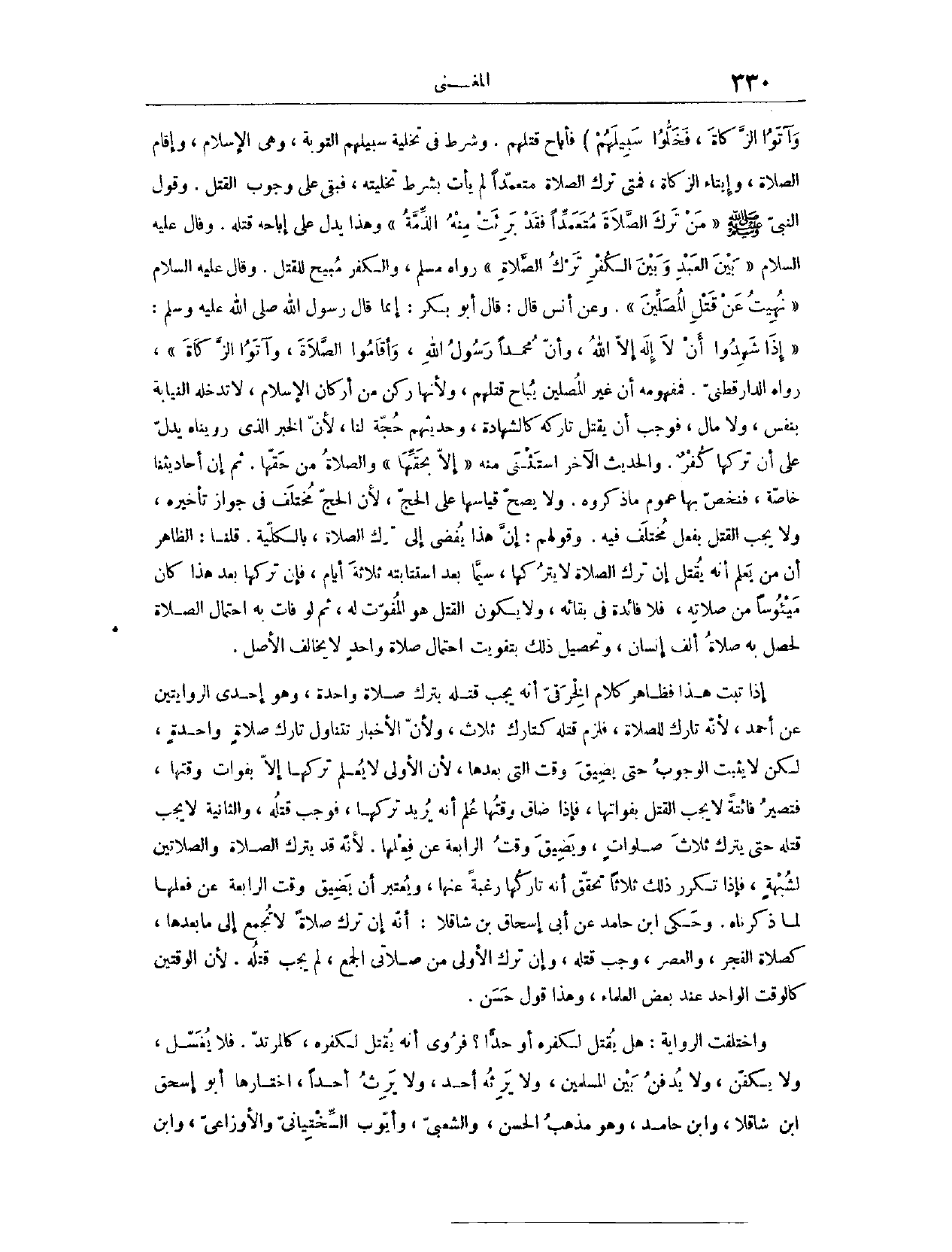 وَالْكُفْرُ مُبِيحٌ لِلْقَتْلِ، وَقَالَ - عَلَيْهِ السَّلَامُ -: «نُهِيتُ عَنْ قَتْلِ الْمُصَلِّينَ» . فَمَفْهُومُهُ أَنَّ غَيْرَ الْمُصَلِّينَ يُبَاحُ قَتْلُهُمْ. وَلِأَنَّهَا رُكْنٌ مِنْ أَرْكَانِ الْإِسْلَامِ لَا تَدْخُلُهُ النِّيَابَةُ بِنَفْسٍ وَلَا مَالٍ، فَوَجَبَ أَنْ يُقْتَلَ تَارِكُهُ كَالشَّهَادَةِ، وَحَدِيثُهُمْ حُجَّةٌ لَنَا؛ لِأَنَّ الْخَبَرَ الَّذِي رَوَيْنَاهُ يَدُلُّ عَلَى أَنَّ تَرْكَهَا كُفْرٌ، وَالْحَدِيثُ الْآخَرُ اسْتَثْنَى مِنْهُ «إلَّا بِحَقِّهَا» . وَالصَّلَاةُ مِنْ حَقِّهَا. وَعَنْ أَنَسٍ، قَالَ: قَالَ أَبُو بَكْرٍ: إنَّمَا قَالَ رَسُولُ اللَّهِ - صَلَّى اللَّهُ عَلَيْهِ وَسَلَّمَ -: «إذَا شَهِدُوا أَنْ لَا إلَهَ إلَّا اللَّهُ، وَأَنَّ مُحَمَّدًا رَسُولُ اللَّهِ، وَأَقَامُوا الصَّلَاةَ، وَآتَوْا الزَّكَاةَ.» رَوَاهُ الدَّارَقُطْنِيّ.
