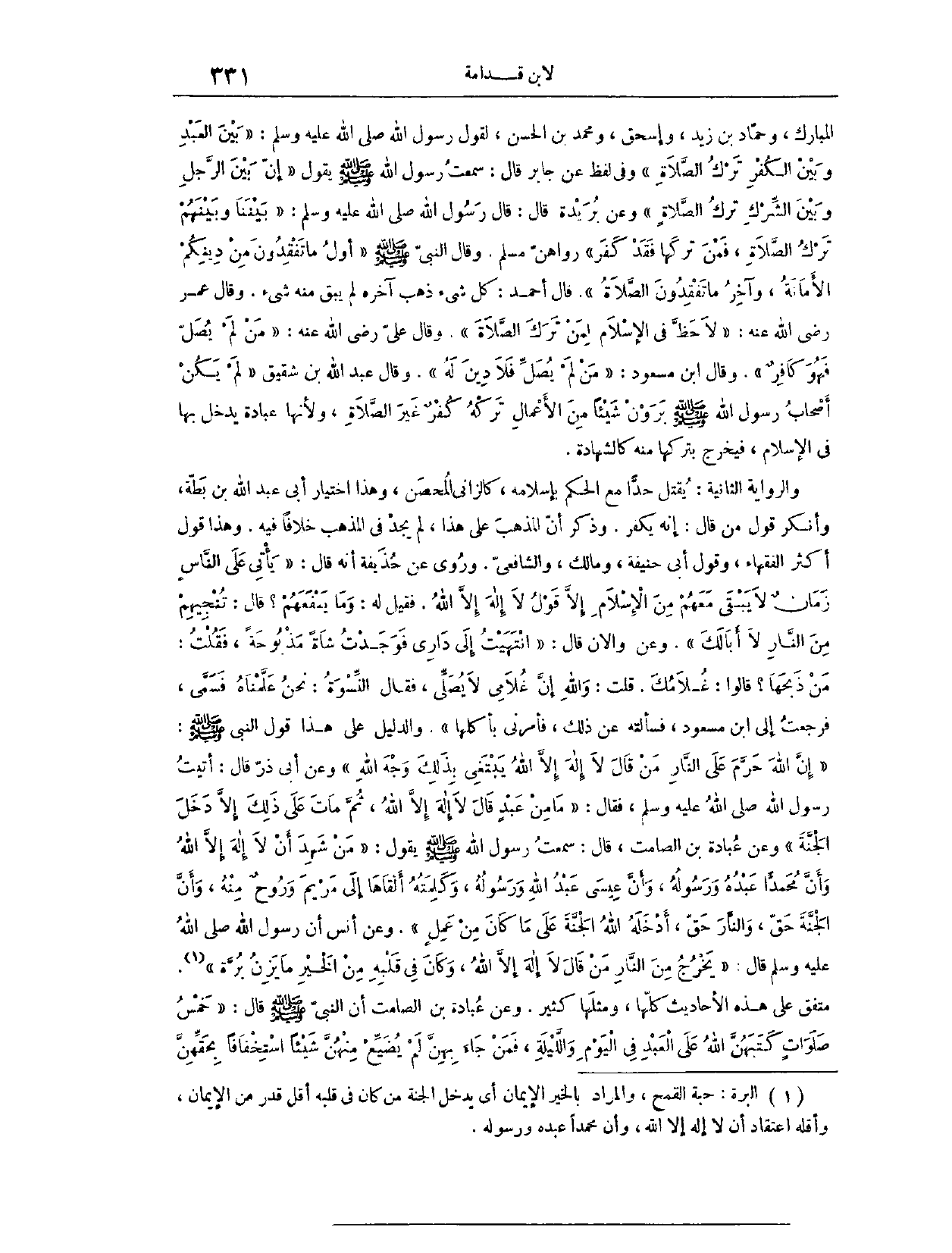 الْمُبَارَكِ وَحَمَّادِ بْنِ زَيْدٍ، وَإِسْحَاقَ، وَمُحَمَّدِ بْنِ الْحَسَنِ، لِقَوْلِ رَسُولِ اللَّهِ - صَلَّى اللَّهُ عَلَيْهِ وَسَلَّمَ -: «بَيْنَ الْعَبْدِ وَبَيْنَ الْكُفْرِ تَرْكُ الصَّلَاةِ» . وَفِي لَفْظٍ عَنْ جَابِرٍ، قَالَ: سَمِعْت رَسُولَ اللَّهِ - صَلَّى اللَّهُ عَلَيْهِ وَسَلَّمَ - يَقُولُ: «إنَّ بَيْنَ الرَّجُلِ وَبَيْنَ الشِّرْكِ تَرْكَ الصَّلَاةِ» . وَعَنْ بُرَيْدَةَ، قَالَ: قَالَ رَسُولُ اللَّهِ - صَلَّى اللَّهُ عَلَيْهِ وَسَلَّمَ -: «بَيْنَنَا وَبَيْنَهُمْ تَرْكُ الصَّلَاةِ، فَمَنْ تَرَكَهَا فَقَدْ كَفَرَ» رَوَاهُنَّ مُسْلِمٌ