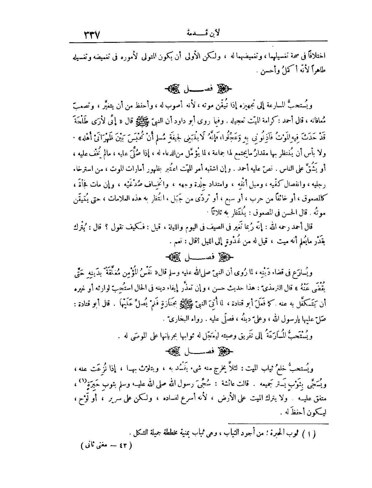 (١٤٩٧) فَصْلٌ: وَيُسْتَحَبُّ خَلْعُ ثِيَابِ الْمَيِّتِ؛ لِئَلَّا يَخْرُجَ مِنْهُ شَيْءٌ يَفْسُدُ بِهِ، وَيَتَلَوَّثُ بِهَا، إذَا نُزِعَتْ عَنْهُ، وَيُسَجَّى بِثَوْبٍ يَسْتُرُ جَمِيعَهُ. قَالَتْ عَائِشَةُ: سُجِّيَ رَسُولُ اللَّهِ - صَلَّى اللَّهُ عَلَيْهِ وَسَلَّمَ - بِثَوْبٍ حِبَرَةٍ. مُتَّفَقٌ عَلَيْهِ. وَلَا يُتْرَكُ الْمَيِّتُ عَلَى الْأَرْضِ؛ لِأَنَّهُ أَسْرَعُ لِفَسَادِهِ، وَلَكِنْ عَلَى سَرِيرٍ أَوْ لَوْحٍ، لِيَكُونَ أَحْفَظَ لَهُ.