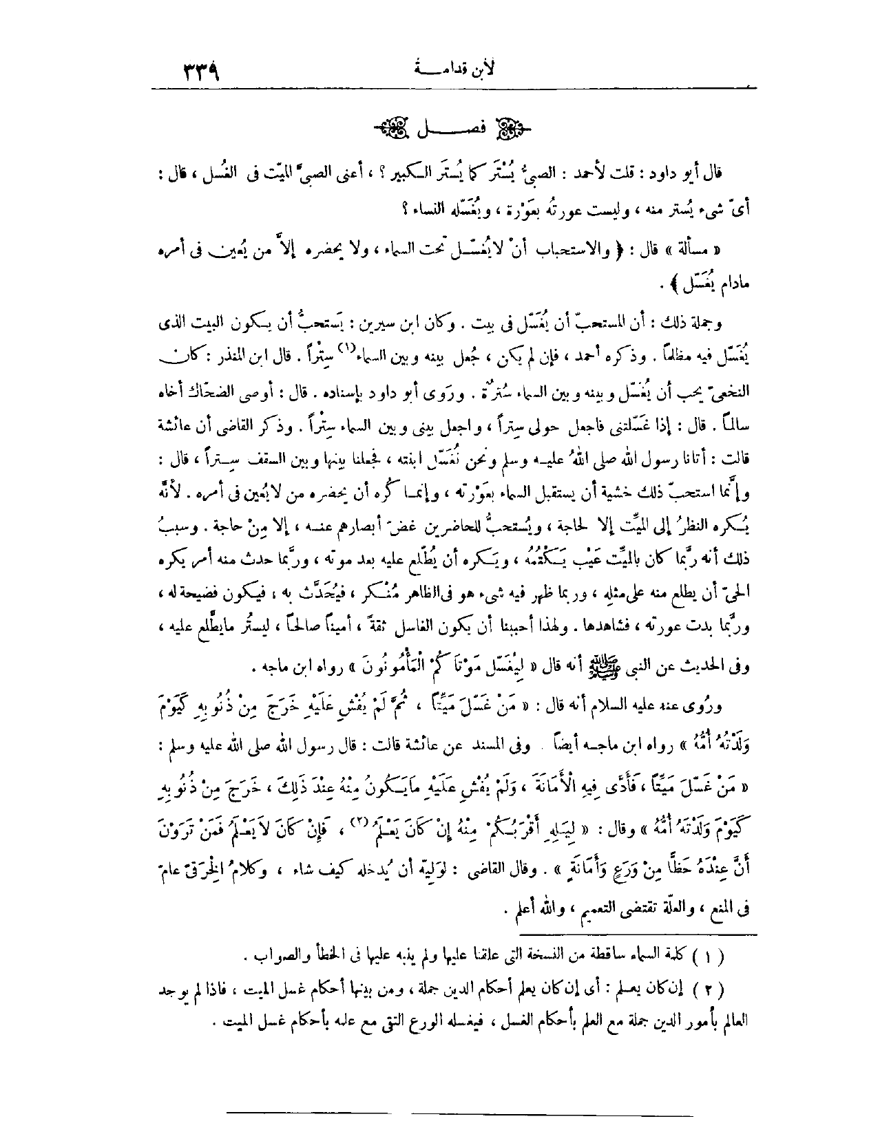 (١٤٩٩) فَصْلٌ: قَالَ أَبُو دَاوُد: قُلْت لِأَحْمَدَ الصَّبِيُّ يُسْتَرُ كَمَا يُسْتَرُ الْكَبِيرُ، أَعْنِي الصَّبِيَّ الْمَيِّتَ فِي الْغُسْلِ. قَالَ: أَيُّ شَيْءٍ يُسْتَرُ مِنْهُ، وَلَيْسَتْ عَوْرَتُهُ بِعَوْرَةٍ وَيُغَسِّلُهُ النِّسَاءُ؟