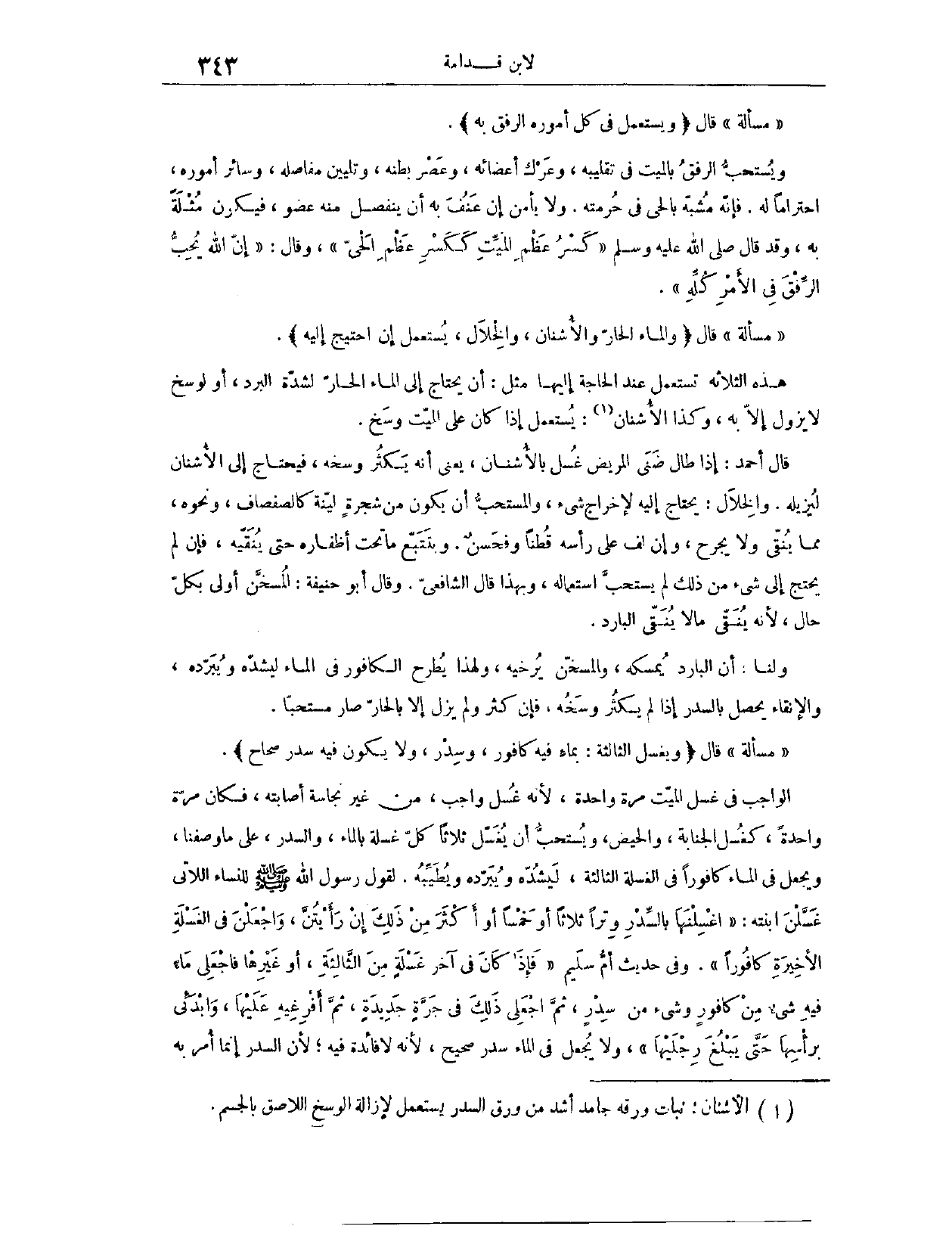 (١٥٠٩) مَسْأَلَةٌ؛ قَالَ (وَالْمَاءُ الْحَارُّ وَالْأُشْنَانُ، وَالْخِلَالُ، يُسْتَعْمَلُ إنْ اُحْتِيجَ إلَيْهِ) هَذِهِ الثَّلَاثَةُ تُسْتَعْمَلُ عِنْدَ الْحَاجَةِ إلَيْهَا، مِثْلُ أَنْ يُحْتَاجَ إلَى الْمَاءِ الْحَارِّ لِشِدَّةِ الْبَرْدِ، أَوْ لَوَسَخٍ لَا يَزُولُ إلَّا بِهِ، وَكَذَا الْأُشْنَانُ يُسْتَعْمَلُ إذَا كَانَ عَلَى الْمَيِّتِ وَسَخٌ. قَالَ أَحْمَدُ: إذَا طَالَ ضَنَى الْمَرِيضِ غُسِّلَ بِالْأُشْنَانِ. يَعْنِي أَنَّهُ يَكْثُرُ وَسَخُهُ، فَيَحْتَاجُ إلَى الْأُشْنَانِ لِيُزِيلَهُ.