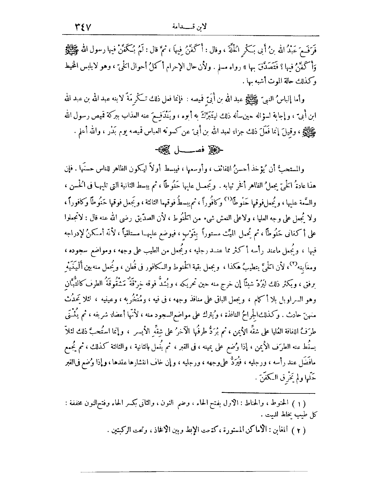 وَلِأَنَّ حَالَ الْإِحْرَامِ أَكْمَلُ أَحْوَالِ الْحَيِّ وَهُوَ لَا يَلْبَسُ الْمَخِيطَ، وَكَذَلِكَ حَالَةُ الْمَوْتِ أَشْبَهُ بِهَا. وَأَمَّا إلْبَاسُ النَّبِيِّ - صَلَّى اللَّهُ عَلَيْهِ وَسَلَّمَ - عَبْدَ اللَّهِ بْنَ أُبَيٍّ قَمِيصَهُ، فَإِنَّمَا فَعَلَ ذَلِكَ تَكْرِمَةً لِابْنِهِ عَبْدِ اللَّهِ بْنِ عَبْدِ اللَّهِ بْنِ أُبَيٍّ، وَإِجَابَةً لِسُؤَالِهِ حِين سَأَلَهُ ذَلِكَ؛ لِيَتَبَرَّكَ بِهِ أَبُوهُ، وَيَنْدَفِعَ عَنْهُ الْعَذَابُ بِبَرَكَةِ قَمِيصِ رَسُولِ اللَّهِ - صَلَّى اللَّهُ عَلَيْهِ وَسَلَّمَ -. وَقِيلَ: إنَّمَا فَعَلَ ذَلِكَ جَزَاءً لِعَبْدِ اللَّهِ بْنِ أُبَيٍّ عَنْ كُسْوَتِهِ الْعَبَّاسَ قَمِيصَهُ يَوْمَ بَدْرٍ. وَاَللَّهُ أَعْلَمُ.