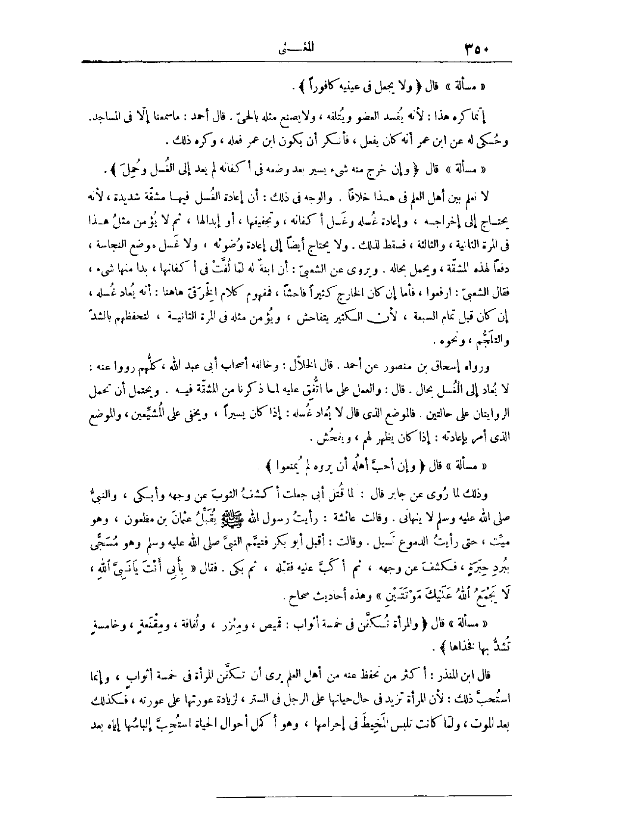 وَيُرْوَى عَنْ الشَّعْبِيِّ أَنَّ ابْنَةً لَهُ لَمَّا لُفَّتْ فِي أَكْفَانِهَا. بَدَا مِنْهَا شَيْءٌ، فَقَالَ الشَّعْبِيُّ: ارْفَعُوا. فَأَمَّا إنْ كَانَ الْخَارِجُ كَثِيرًا فَاحِشًا فَمَفْهُومُ كَلَامِ الْخِرَقِيِّ هَاهُنَا أَنَّهُ يُعَادُ غُسْلُهُ إنْ كَانَ قَبْلَ تَمَامِ السَّبْعَةِ؛ لِأَنَّ الْكَثِيرَ يَتَفَاحَشُ، وَيُؤْمَنُ مِثْلُهُ فِي الْمَرَّةِ الثَّانِيَةِ، لِتَحَفُّظِهِمْ، بِالشَّدِّ وَالتَّلَجُّمِ وَنَحْوِهِ. وَرَوَاهُ إِسْحَاقُ بْنُ مَنْصُورٍ عَنْ أَحْمَدَ. قَالَ الْخَلَّالُ: وَخَالَفَهُ أَصْحَابُ أَبِي عَبْدِ اللَّهِ، كُلُّهُمْ رَوَوْا عَنْهُ: لَا يُعَادُ إلَى الْغُسْلِ بِحَالٍ. قَالَ: وَالْعَمَلُ عَلَى مَا اُتُّفِقَ عَلَيْهِ؛ لِمَا ذَكَرْنَا مِنْ الْمَشَقَّةِ فِيهِ.