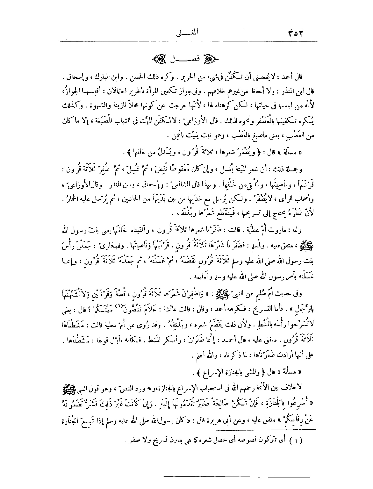 (١٥٣١) فَصْلٌ: قَالَ أَحْمَدُ لَا يُعْجِبُنِي أَنْ تُكَفَّنَ فِي شَيْءٍ مِنْ الْحَرِيرِ. وَكَرِهَ ذَلِكَ الْحَسَنُ، وَابْنُ الْمُبَارَكِ، وَإِسْحَاقُ قَالَ ابْنُ الْمُنْذِرِ: وَلَا أَحْفَظُ مِنْ غَيْرِهِمْ خِلَافَهُمْ. وَفِي جَوَازِ تَكْفِينِ الْمَرْأَةِ بِالْحَرِيرِ احْتِمَالَانِ؛ لِأَنَّ أَقْيَسَهُمَا الْجَوَازُ، لِأَنَّهُ مِنْ لِبَاسِهَا فِي حَيَاتِهَا، لَكِنْ كَرِهْنَاهُ لَهَا، لِأَنَّهَا خَرَجَتْ عَنْ كَوْنِهَا مَحَلًّا لِلزِّينَةِ وَالشَّهْوَةِ، وَكَذَلِكَ يُكْرَهُ تَكْفِينُهَا بِالْمُعَصْفَرِ، وَنَحْوِهِ؛ لِذَلِكَ.