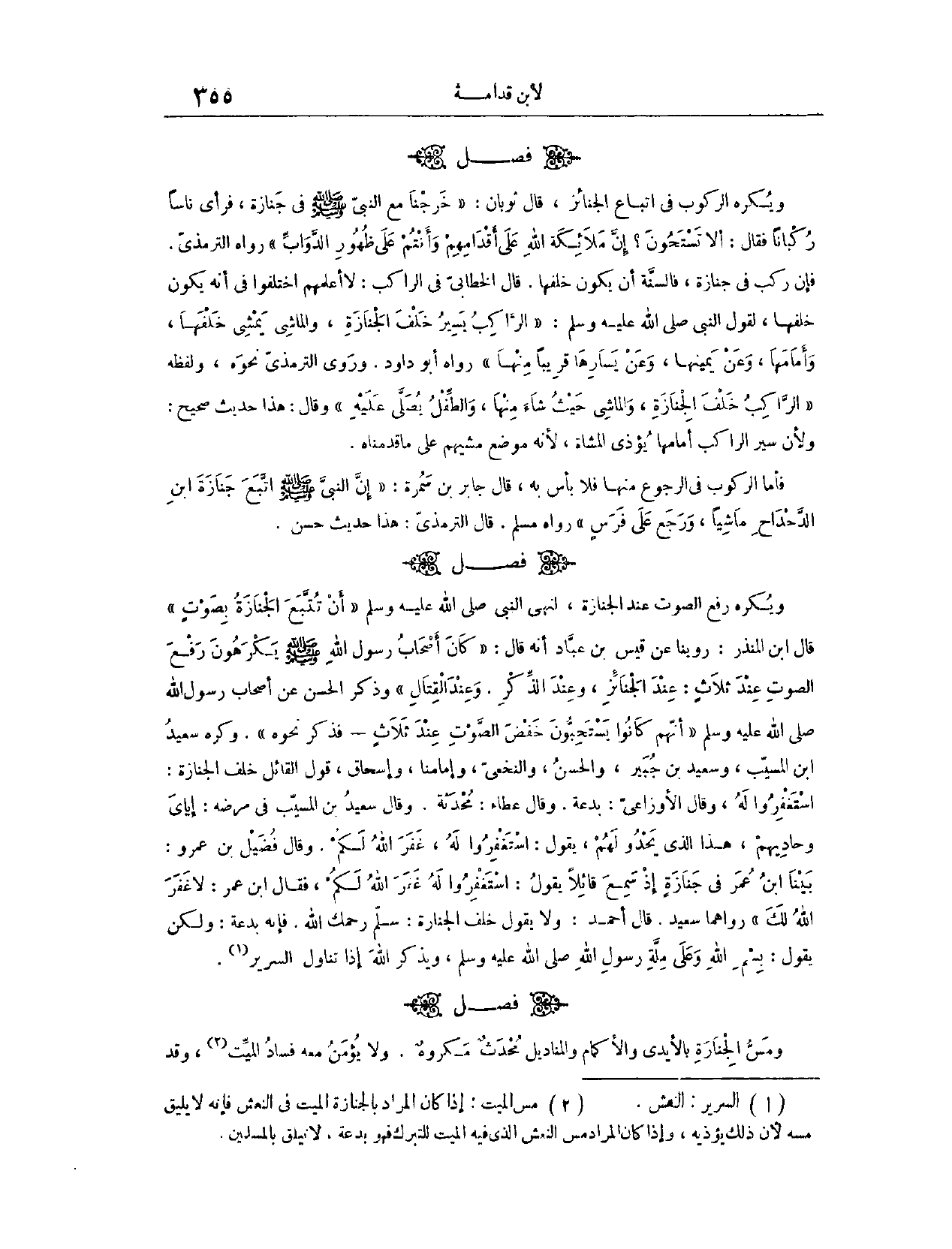 (١٥٣٧) فَصْلٌ: وَيُكْرَهُ الرُّكُوبُ فِي اتِّبَاعِ الْجَنَائِزِ. قَالَ ثَوْبَانُ: «خَرَجْنَا مَعَ النَّبِيِّ - صَلَّى اللَّهُ عَلَيْهِ وَسَلَّمَ - فِي جِنَازَةٍ، فَرَأَى نَاسًا رُكْبَانًا، فَقَالَ: أَلَا تَسْتَحْيُونَ؟ إنَّ مَلَائِكَةَ اللَّهِ عَلَى أَقْدَامِهِمْ، وَأَنْتُمْ عَلَى ظُهُورِ الدَّوَابِّ» . رَوَاهُ التِّرْمِذِيُّ. فَإِنْ رَكِبَ فِي جِنَازَةٍ فَالسُّنَّةُ أَنْ يَكُونَ خَلْفَهَا، قَالَ الْخَطَّابِيُّ فِي الرَّاكِبِ: لَا أَعْلَمُهُمْ اخْتَلَفُوا فِي أَنَّهُ يَكُونُ خَلْفَهَا؛ لِقَوْلِ النَّبِيِّ - صَلَّى اللَّهُ عَلَيْهِ وَسَلَّمَ -: «الرَّاكِبُ يَسِيرُ خَلْفَ الْجِنَازَةِ، وَالْمَاشِي يَمْشِي خَلْفَهَا وَأَمَامَهَا، وَعَنْ يَمِينهَا وَعَنْ يَسَارِهَا، قَرِيبًا مِنْهَا» . رَوَاهُ أَبُو دَاوُد. وَرَوَى التِّرْمِذِيُّ نَحْوَهُ، وَلَفْظُهُ: «الرَّاكِبُ خَلْفَ الْجِنَازَةِ، وَالْمَاشِي حَيْثُ شَاءَ مِنْهَا، وَالطِّفْلُ يُصَلَّى عَلَيْهِ» . وَقَالَ: هَذَا حَدِيثٌ صَحِيحٌ.