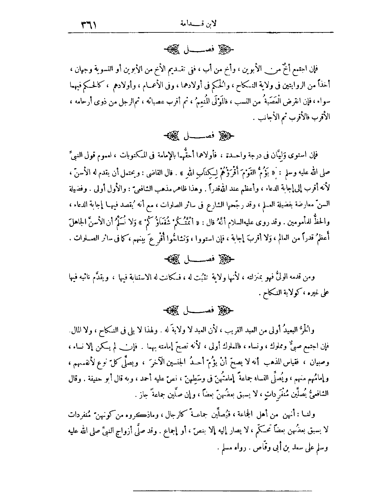 (١٥٥٢) فَصْلٌ: فَإِنْ اجْتَمَعَ أَخٌ مِنْ الْأَبَوَيْنِ، وَأَخٌ مِنْ أَبٍ فَفِي تَقْدِيمِ الْأَخِ مِنْ الْأَبَوَيْنِ، أَوْ التَّسْوِيَةِ، وَجْهَانِ، أَخْذًا مِنْ الرِّوَايَتَيْنِ فِي وِلَايَةِ النِّكَاحِ، وَالْحُكْمُ فِي أَوْلَادِهِمَا، وَفِي الْأَعْمَامِ وَأَوْلَادِهِمْ، كَالْحُكْمِ فِيهِمَا سَوَاءٌ. فَإِنْ انْقَرَضَ الْعَصَبَةُ مِنْ النَّسَبِ فَالْمَوْلَى الْمُنْعِمُ، ثُمَّ أَقْرَبُ عَصَبَاتِهِ، ثُمَّ الرَّجُلُ مِنْ ذَوِي أَرْحَامِهِ، الْأَقْرَبُ فَالْأَقْرَبُ، ثُمَّ الْأَجَانِبُ