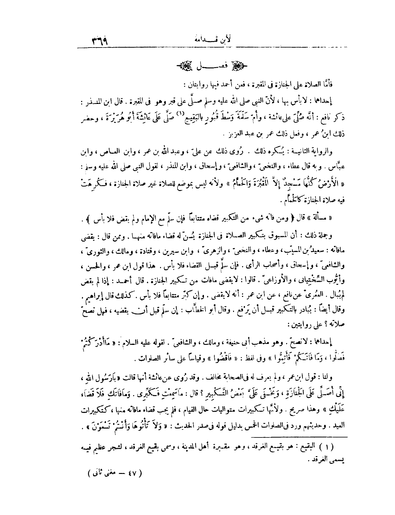(١٥٧٢) فَصْلٌ: فَأَمَّا الصَّلَاةُ عَلَى الْجِنَازَةِ فِي الْمَقْبَرَةِ فَعَنْ أَحْمَدَ فِيهَا رِوَايَتَانِ. إحْدَاهُمَا: لَا بَأْسَ بِهَا؛ لِأَنَّ النَّبِيَّ - صَلَّى اللَّهُ عَلَيْهِ وَسَلَّمَ - صَلَّى عَلَى قَبْرٍ وَهُوَ فِي الْمَقْبَرَةِ. قَالَ ابْنُ الْمُنْذِرِ ذَكَرَ نَافِعٌ أَنَّهُ صُلِّيَ عَلَى عَائِشَةَ وَأُمِّ سَلَمَةَ وَسْطَ قُبُورِ الْبَقِيعِ صَلَّى عَلَى عَائِشَةَ أَبُو هُرَيْرَةَ، وَحَضَرَ ذَلِكَ ابْنُ عُمَرَ وَفَعَلَ ذَلِكَ عُمَرُ بْنُ عَبْدِ الْعَزِيزِ. وَالرِّوَايَةُ الثَّانِيَةُ: يُكْرَهُ ذَلِكَ.