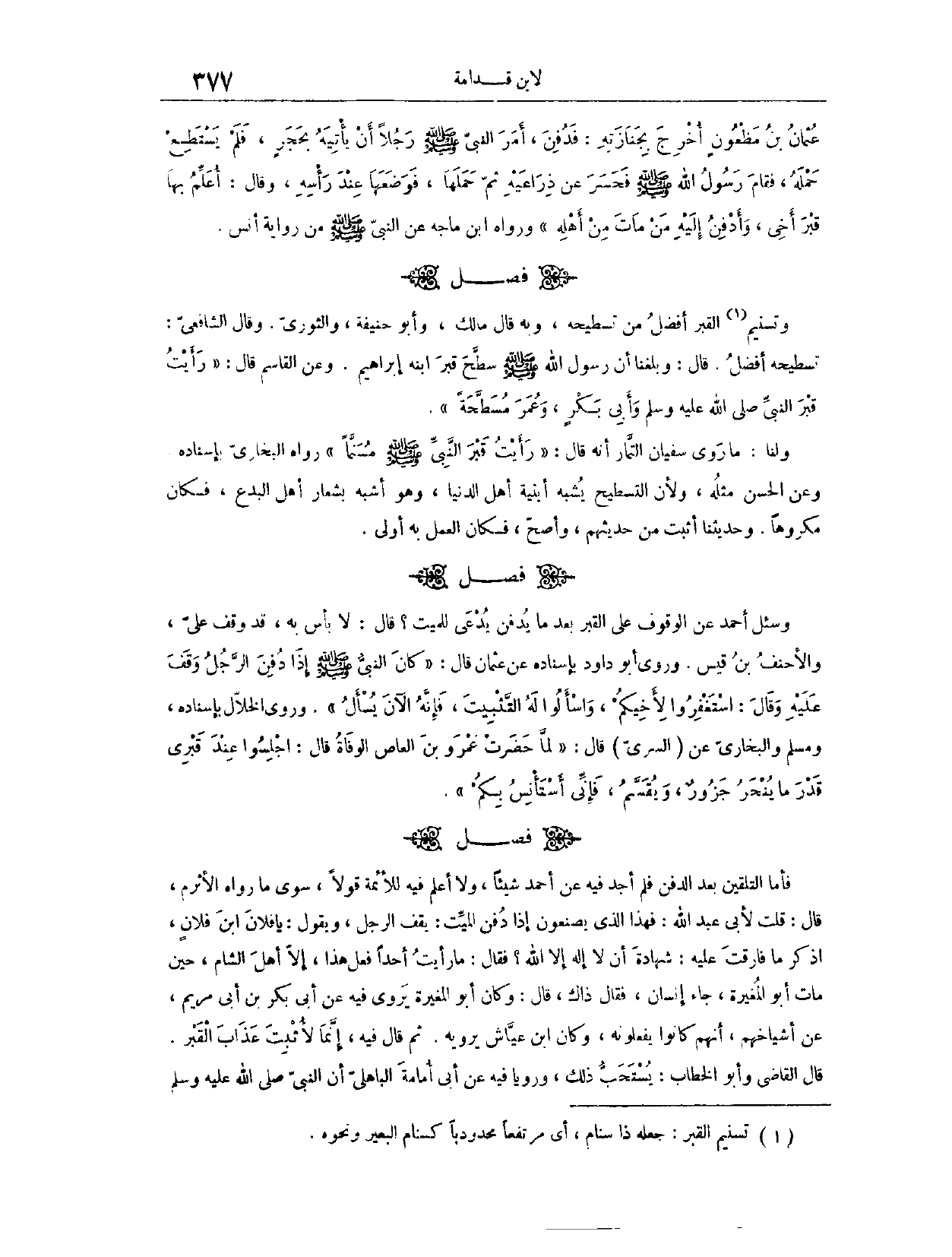(١٥٨٨) فَصْلٌ: وَتَسْنِيمُ الْقَبْرِ أَفْضَلُ مِنْ تَسْطِيحِهِ. وَبِهِ قَالَ مَالِكٌ وَأَبُو حَنِيفَةَ، وَالثَّوْرِيُّ. وَقَالَ الشَّافِعِيُّ: تَسْطِيحُهُ أَفْضَلُ. قَالَ: وَبَلَغَنَا أَنَّ رَسُولَ اللَّهِ - صَلَّى اللَّهُ عَلَيْهِ وَسَلَّمَ - سَطَّحَ قَبْرَ ابْنِهِ إبْرَاهِيمَ. وَعَنْ الْقَاسِمِ قَالَ: رَأَيْتُ قَبْرَ النَّبِيِّ - صَلَّى اللَّهُ عَلَيْهِ وَسَلَّمَ - وَأَبِي بَكْرٍ وَعُمَرَ مُسَطَّحَةً. وَلَنَا مَا رَوَى سُفْيَانُ التَّمَّارُ، أَنَّهُ قَالَ: رَأَيْتُ قَبْرَ النَّبِيِّ - صَلَّى اللَّهُ عَلَيْهِ وَسَلَّمَ - مُسَنَّمًا. رَوَاهُ الْبُخَارِيُّ بِإِسْنَادِهِ وَعَنْ الْحَسَنِ مِثْلُهُ وَلِأَنَّ التَّسْطِيحَ يُشْبِهُ أَبْنِيَةَ أَهْلِ الدُّنْيَا، وَهُوَ أَشْبَهُ بِشِعَارِ أَهْلِ الْبِدَعِ، فَكَانَ مَكْرُوهًا.