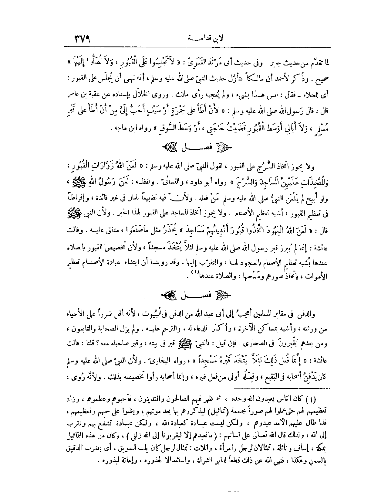 لِمَا تَقَدَّمَ مِنْ حَدِيثِ جَابِرٍ وَفِي حَدِيثِ أَبِي مَرْثَدٍ الْغَنَوِيِّ: «لَا تَجْلِسُوا عَلَى الْقُبُورِ، وَلَا تُصَلُّوا إلَيْهَا» صَحِيحٌ. وَذُكِرَ لِأَحْمَدَ أَنَّ مَالِكًا يَتَأَوَّلُ حَدِيثَ النَّبِيِّ - صَلَّى اللَّهُ عَلَيْهِ وَسَلَّمَ - أَنَّهُ نَهَى أَنْ يُجْلَسَ عَلَى الْقُبُورِ أَيْ لِلْخَلَاءِ.