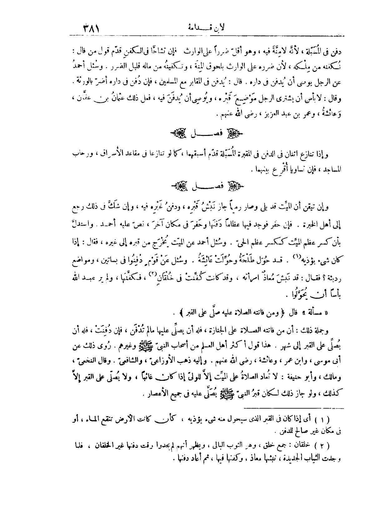 (١٦٠١) فَصْلٌ: وَإِنْ تَيَقَّنَ أَنَّ الْمَيِّتَ قَدْ بَلِيَ وَصَارَ رَمِيمًا، جَازَ نَبْشُ قَبْرِهِ، وَدَفْنُ غَيْرِهِ فِيهِ وَإِنْ شَكَّ فِي ذَلِكَ رَجَعَ إلَى أَهْلِ الْخِبْرَةِ. فَإِنْ حَفَرَ، فَوَجَدَ فِيهَا عِظَامًا دَفَنَهَا، وَحَفَرَ فِي مَكَان آخَرَ. نَصَّ عَلَيْهِ أَحْمَدُ، وَاسْتَدَلَّ بِأَنَّ كَسْرَ عَظْمِ الْمَيِّتِ كَكَسْرِ عَظْمِ الْحَيِّ. وَسُئِلَ أَحْمَدُ عَنْ الْمَيِّتِ يُخْرَجُ مِنْ قَبْرِهِ إلَى غَيْرِهِ فَقَالَ: إذَا كَانَ شَيْءٌ يُؤْذِيهِ، قَدْ حُوِّلَ طَلْحَةُ وَحُوِّلَتْ عَائِشَةُ وَسُئِلَ عَنْ قَوْمٍ دُفِنُوا فِي بَسَاتِينَ وَمَوَاضِعَ رَدِيئَةٍ.