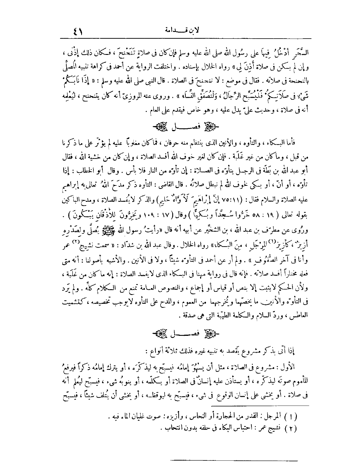 (٩٤١) فَصْلٌ: فَأَمَّا الْبُكَاءُ وَالتَّأَوُّهُ وَالْأَنِينُ الَّذِي يَنْتَظِمُ مِنْهُ حَرْفَانِ فَمَا كَانَ مَغْلُوبًا عَلَيْهِ لَمْ يُؤَثِّرْ عَلَى مَا ذَكَرْنَا مِنْ قَبْلُ وَمَا كَانَ مِنْ غَيْرِ غَلَبَةٍ فَإِنْ كَانَ لِغَيْرِ خَوْفِ اللَّهِ أَفْسَدَ الصَّلَاةَ، وَإِنْ كَانَ مِنْ خَشْيَةِ اللَّهِ، فَقَالَ أَبُو عَبْدِ اللَّهِ بْنُ بَطَّةَ، فِي الرَّجُلِ يَتَأَوَّهُ فِي الصَّلَاةِ: إنْ تَأَوَّهَ مِنْ النَّارِ فَلَا بَأْسَ. وَقَالَ أَبُو الْخَطَّابِ: إذَا تَأَوَّهَ، أَوْ أَنَّ، أَوْ بَكَى لِخَوْفِ اللَّهِ، لَمْ تَبْطُلْ صَلَاتُهُ.